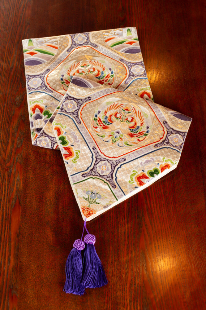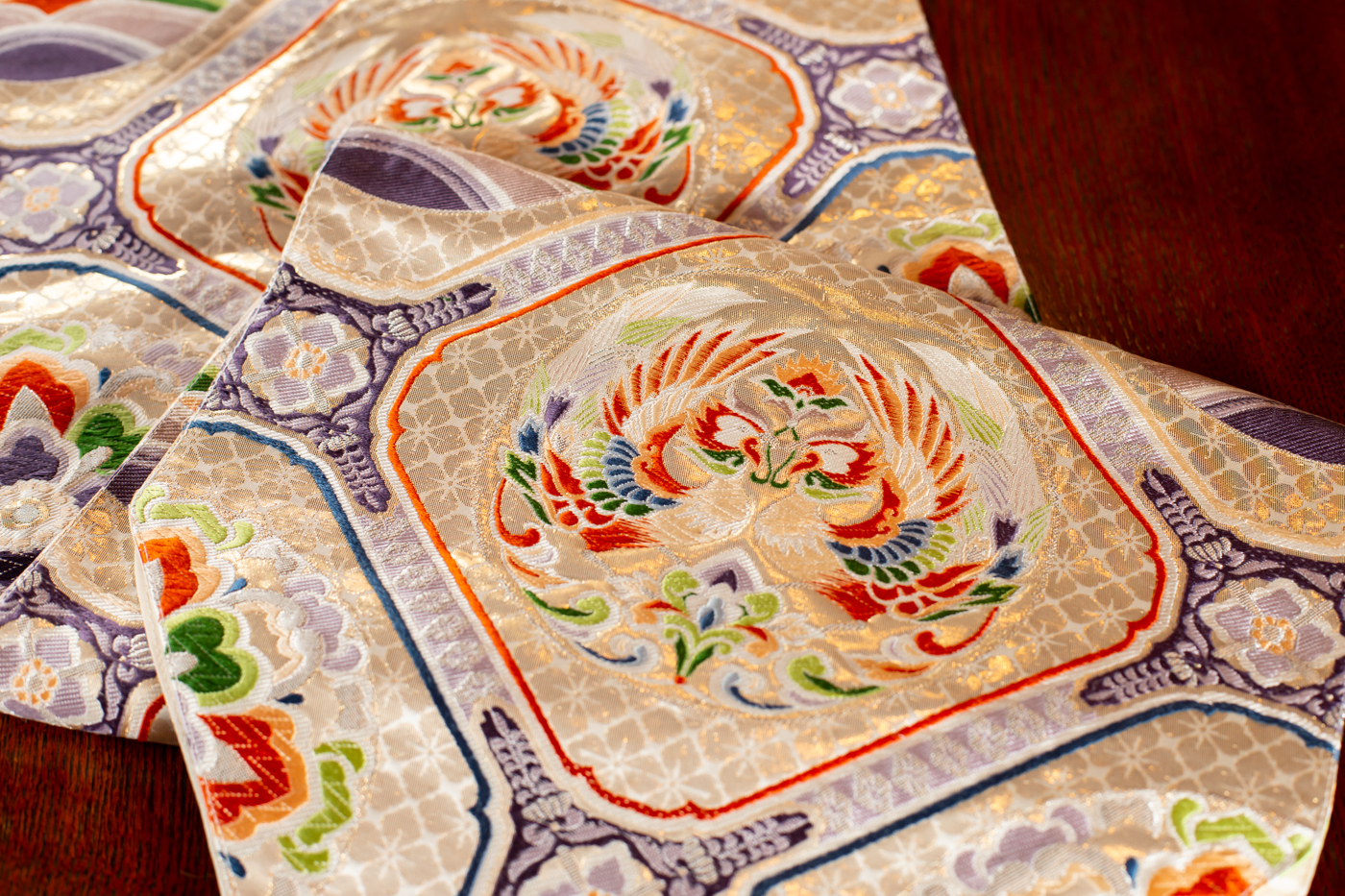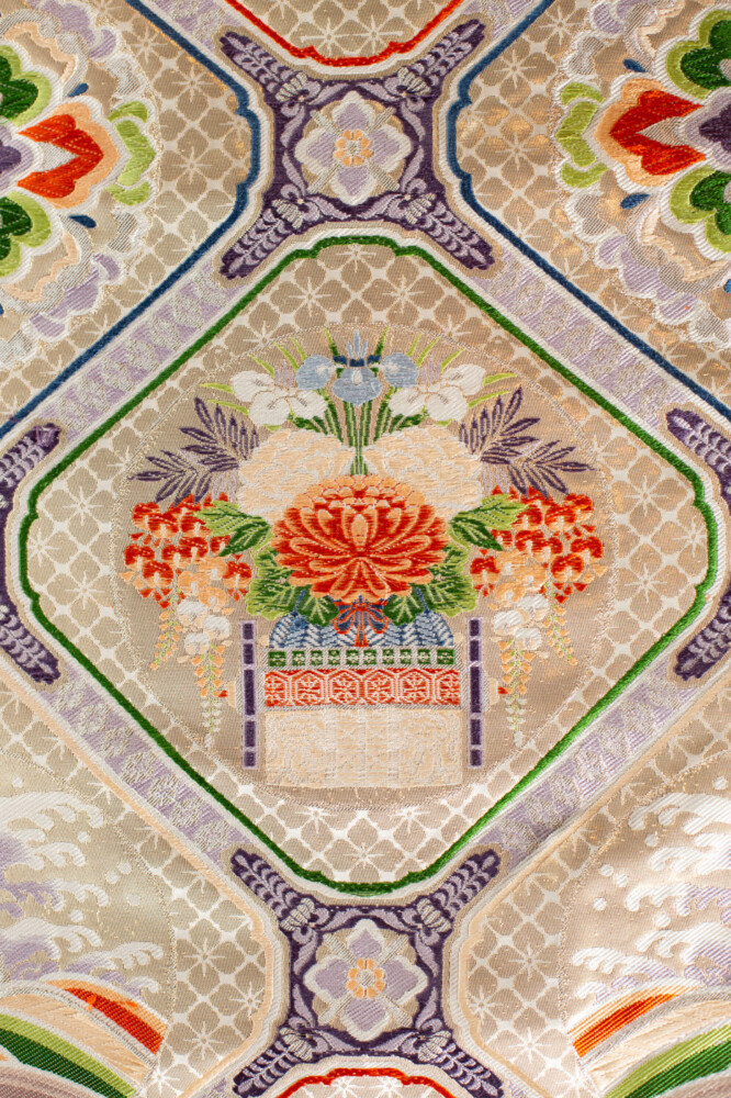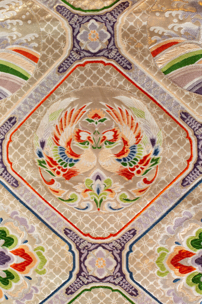 菱の中に、菊、藤、杜若が描かれ、もう一つの菱には向い鳳凰が描かれており、ゴージャスな作品です。