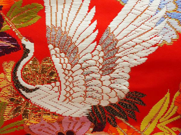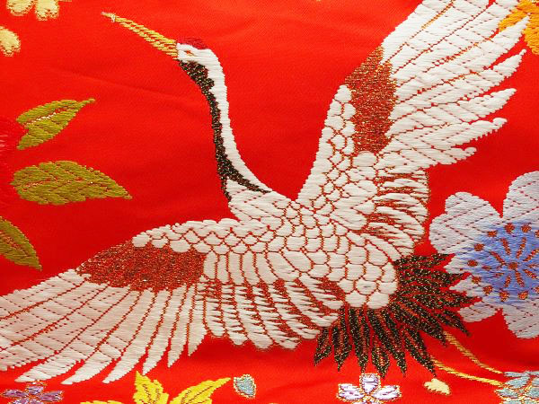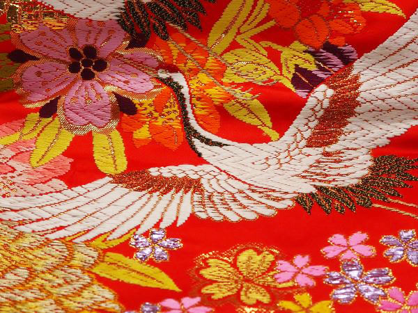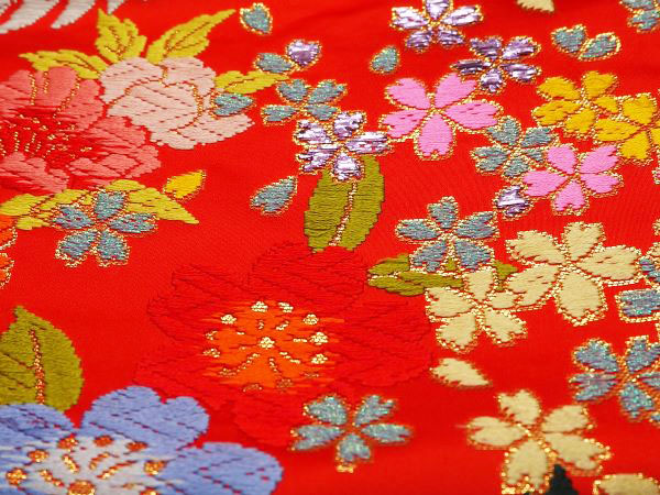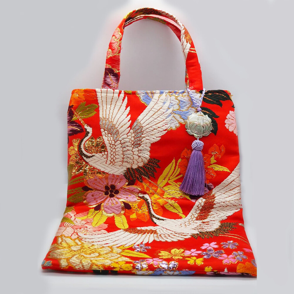 赤地に金、ピンク、黄色の小桜が散って可愛らしい印象のバッグ。