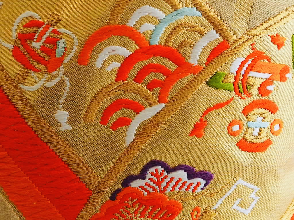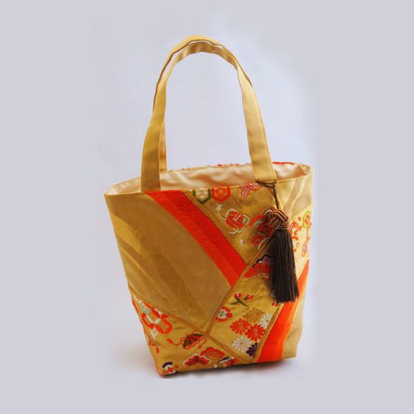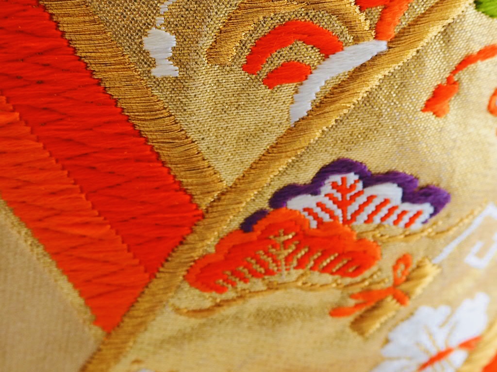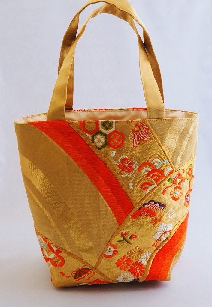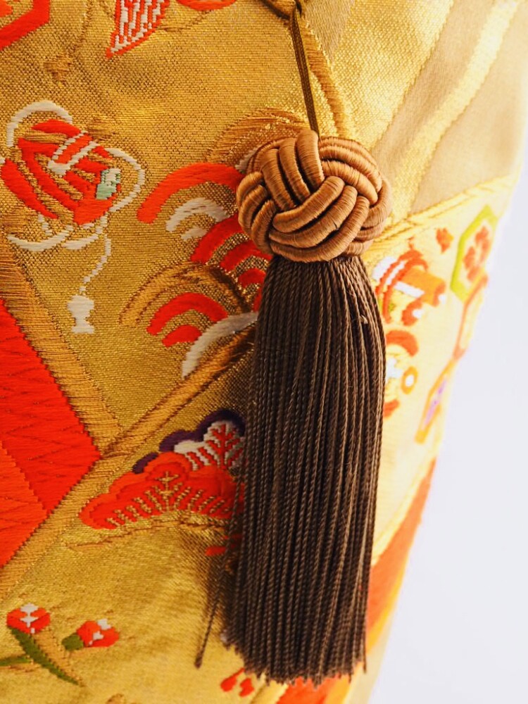 青海波文の中に花菱亀甲、宝尽くし文、笠松、七宝繋ぎなどの吉祥文づくしのカラフルなバケツ型のバッグになりました。