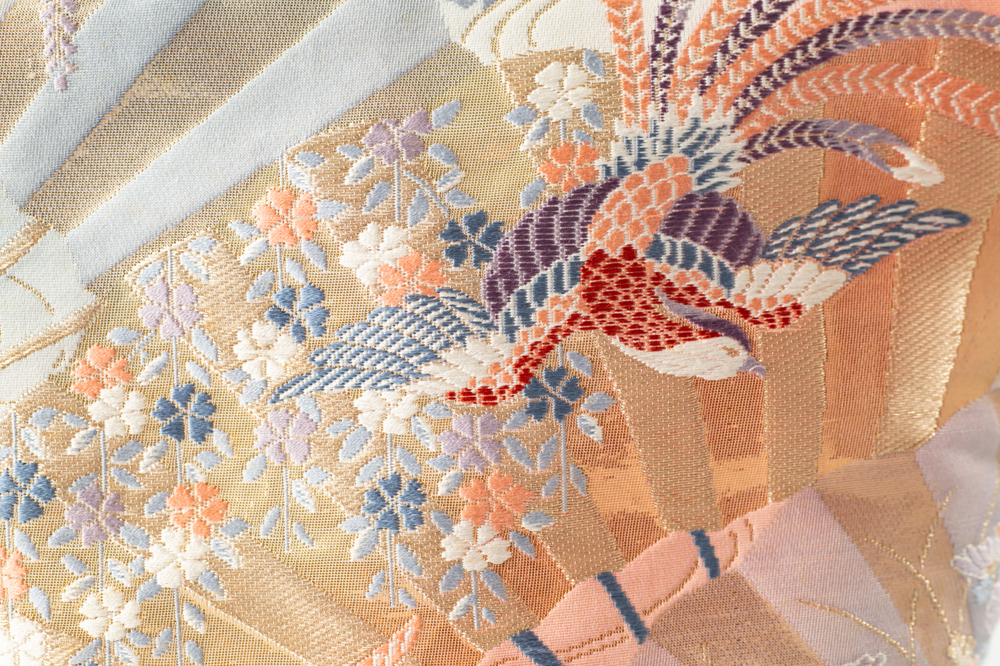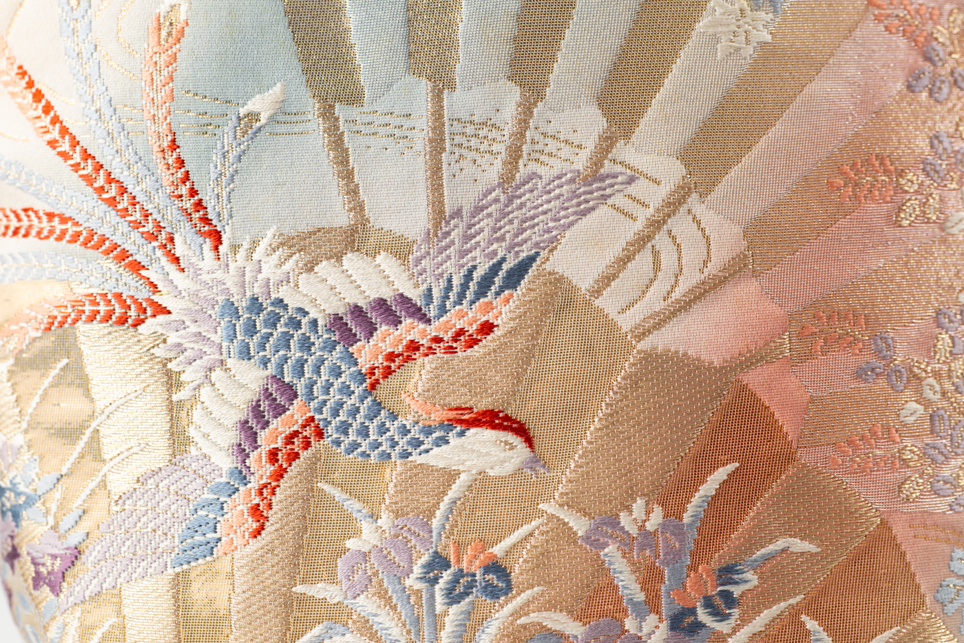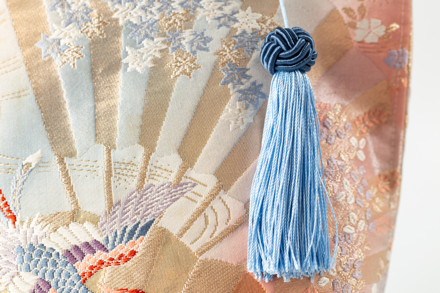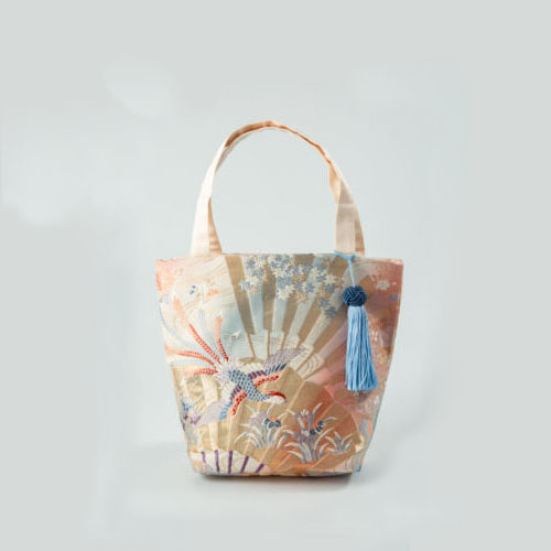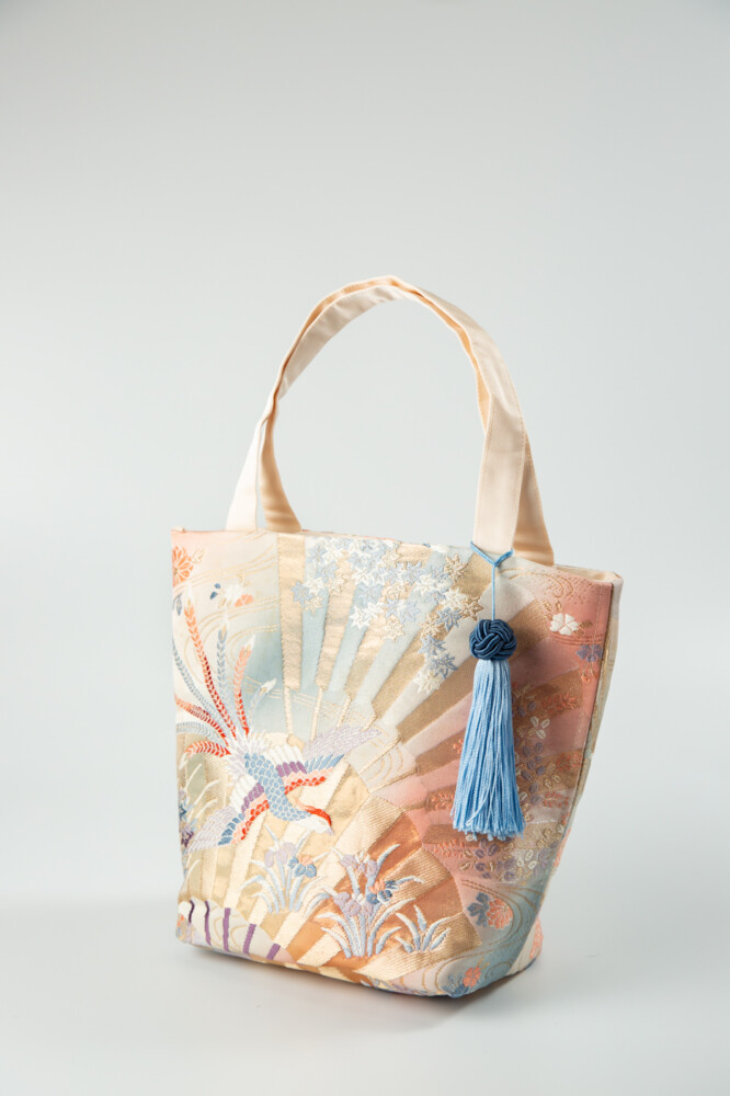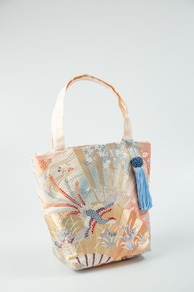 扇面に季節の草花や鳳凰が織り込まれたゴージャスなバッグ。