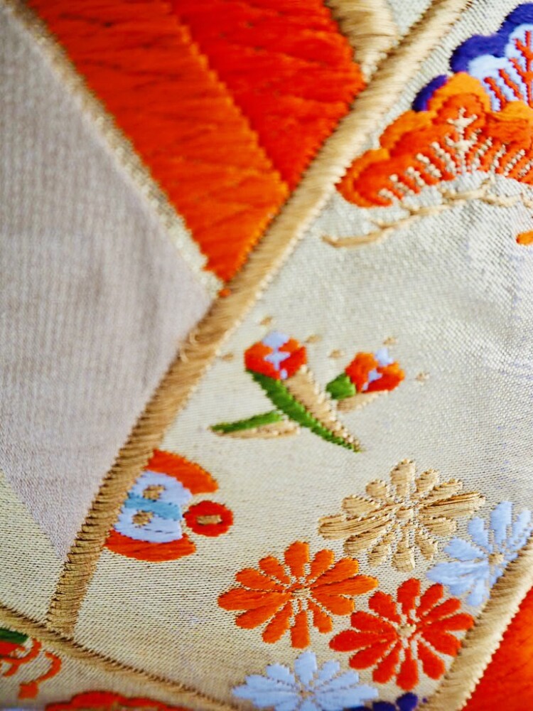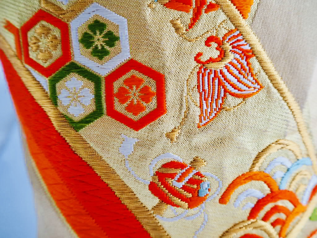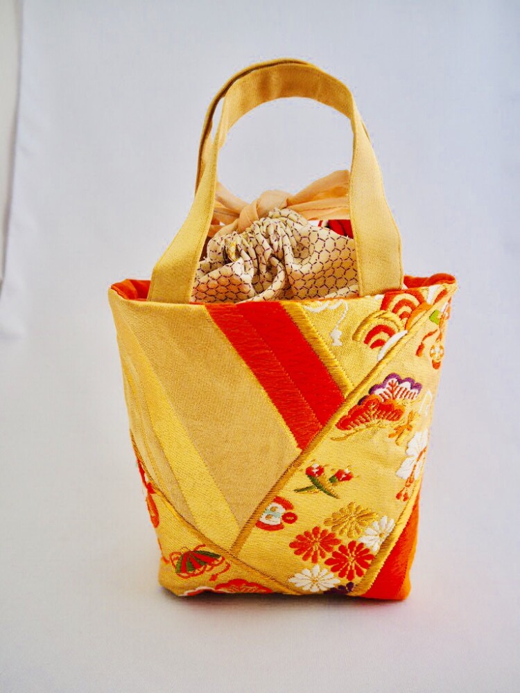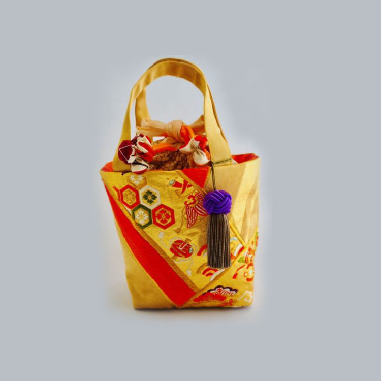 青海波文の中に花菱亀甲、宝尽くし文、笠松、七宝繋ぎなどの吉祥文づくしのカラフルなバッグになりました。
