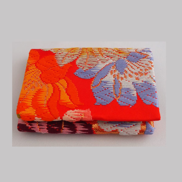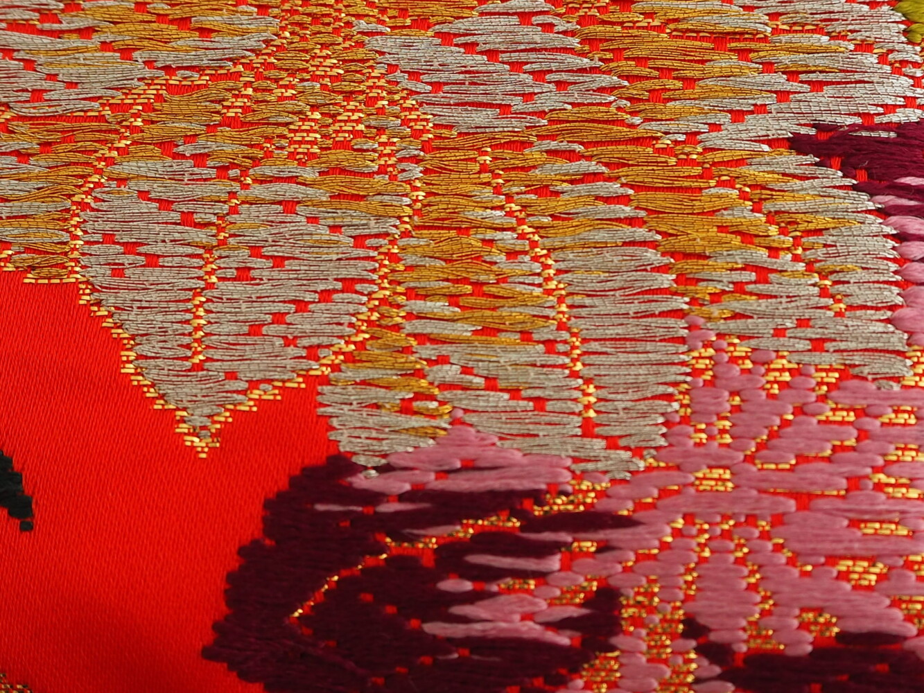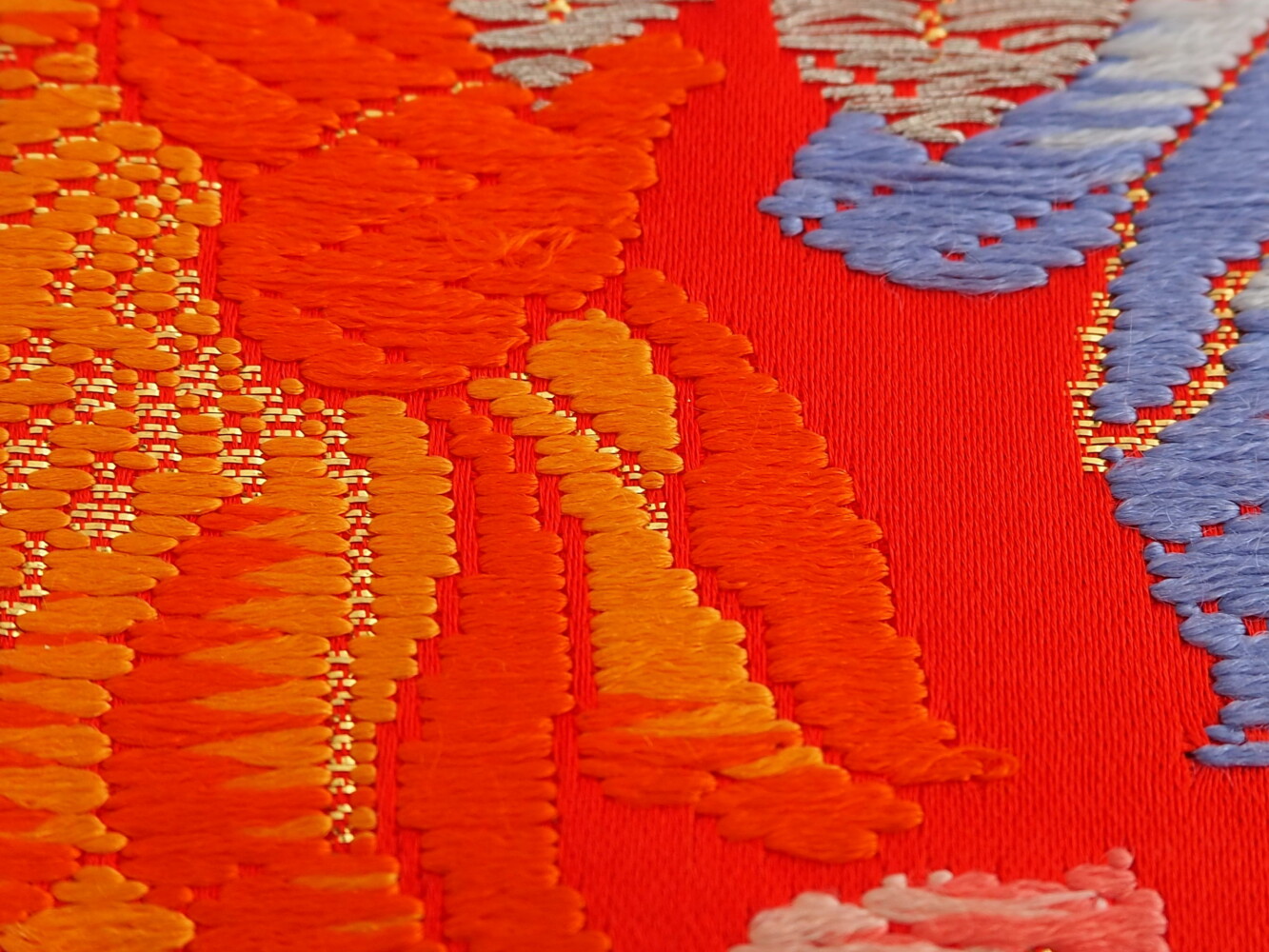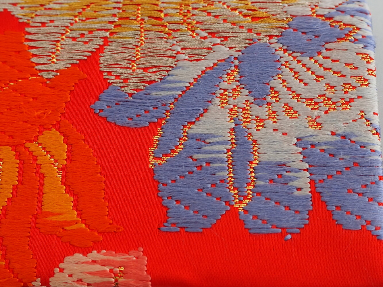 打掛地で赤に水色やオレンジ、黄色の花紋の刺しゅうがゴージャス