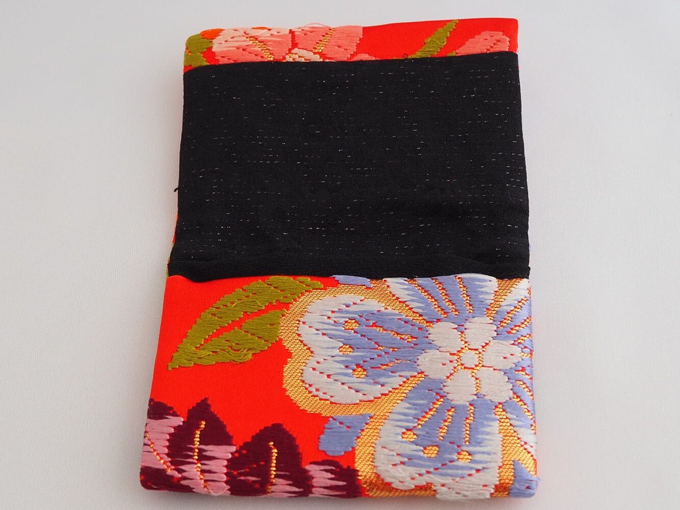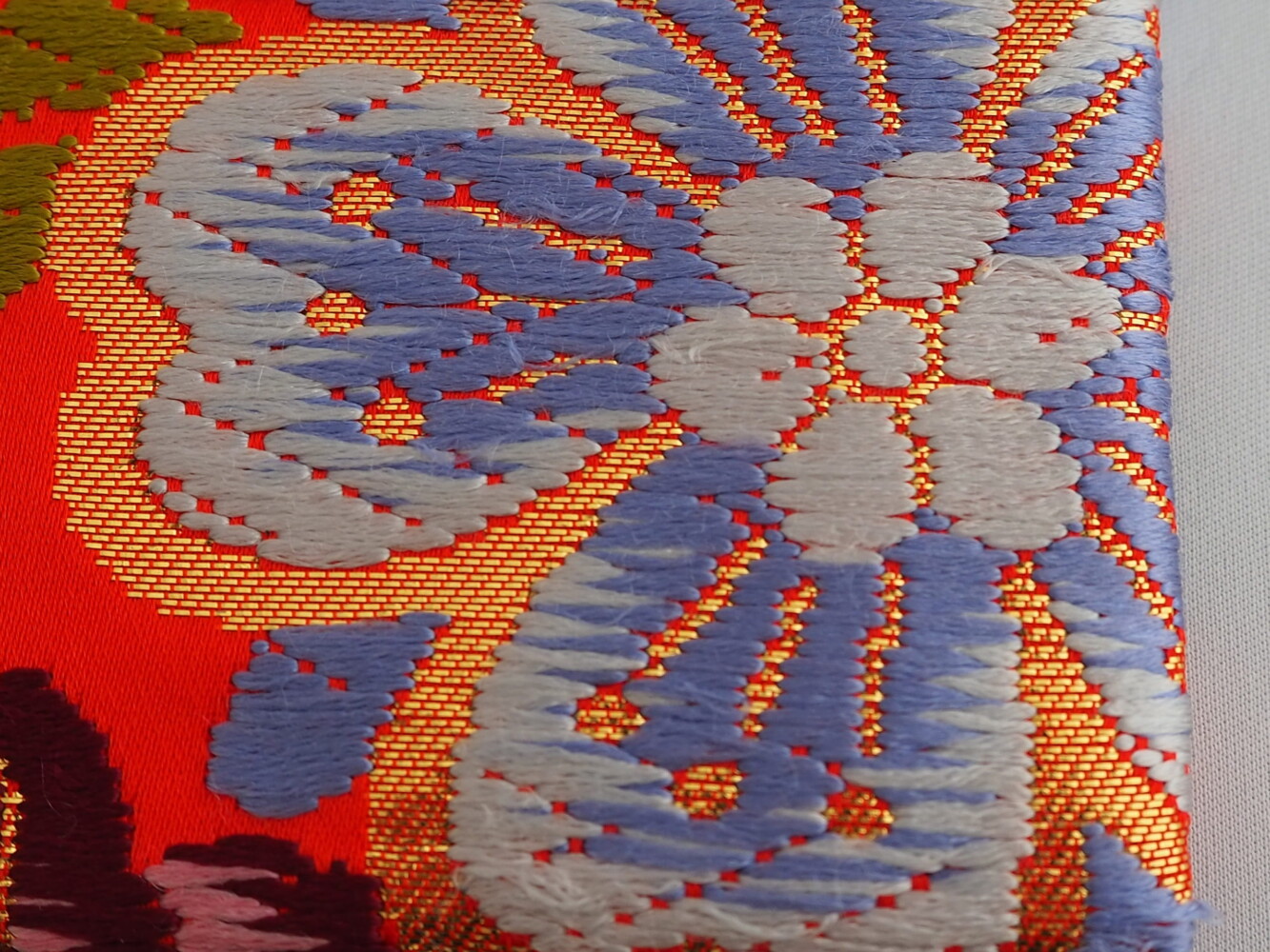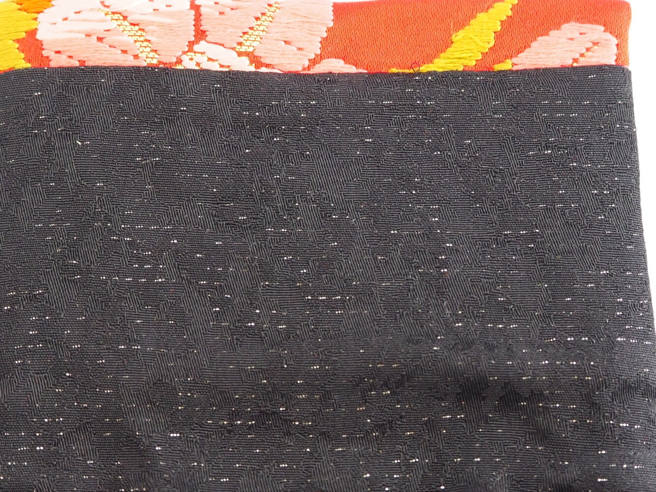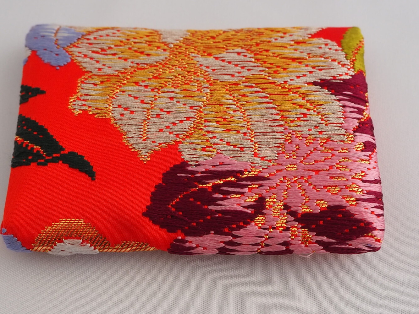 打掛地で赤に水色やオレンジ、黄色の花紋の刺しゅうがゴージャス