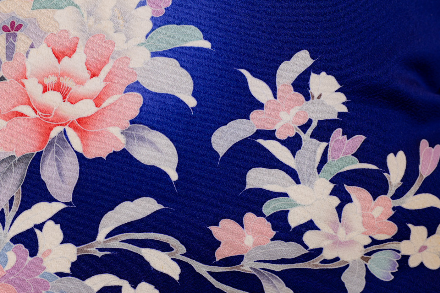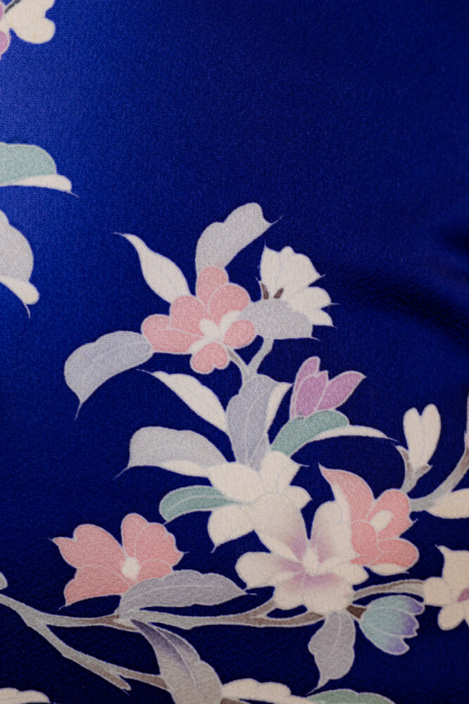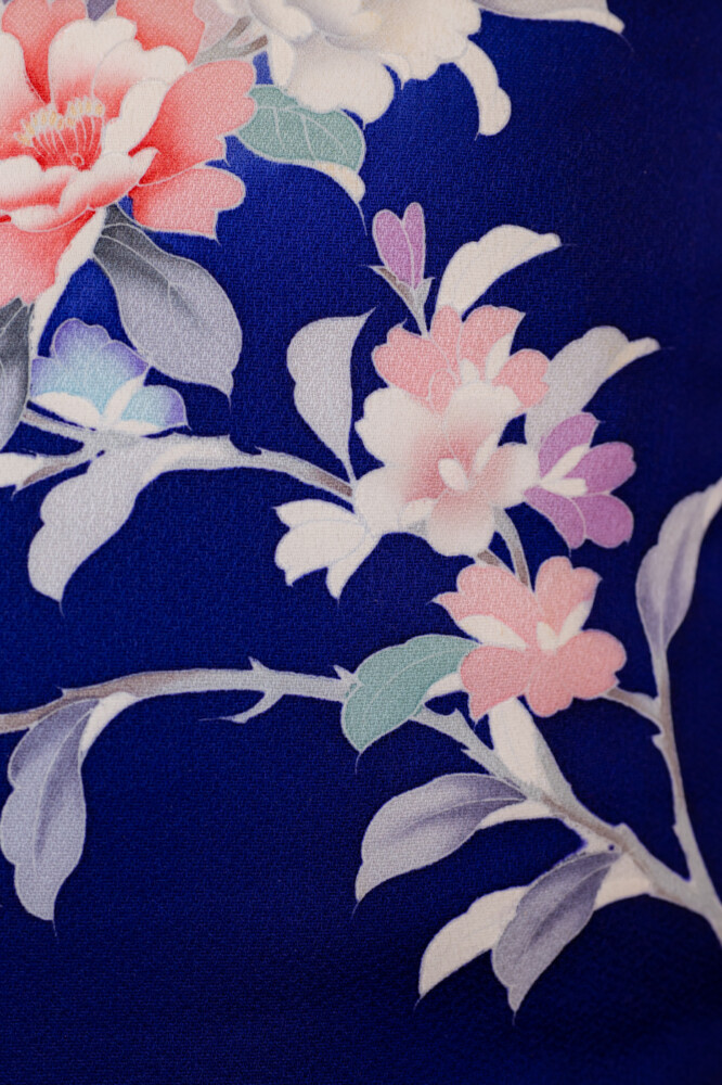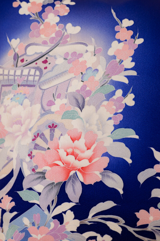 ロイヤルブルー地に御所車や牡丹や菊や紅葉文など