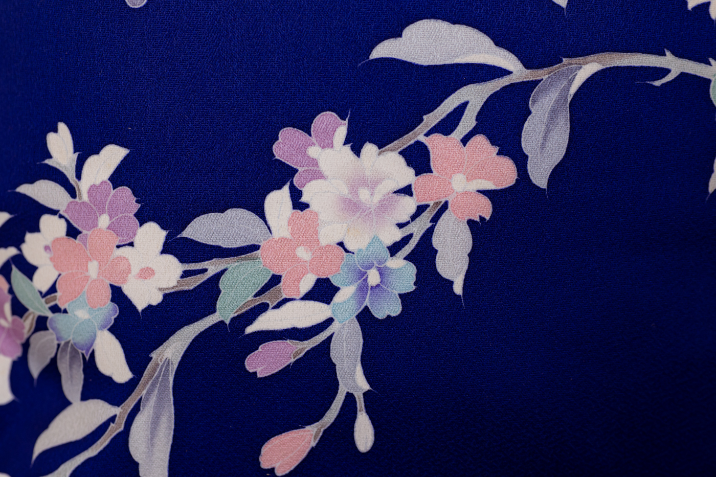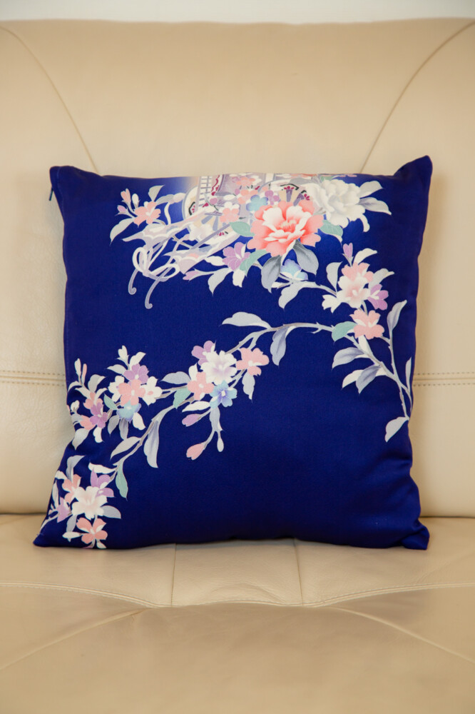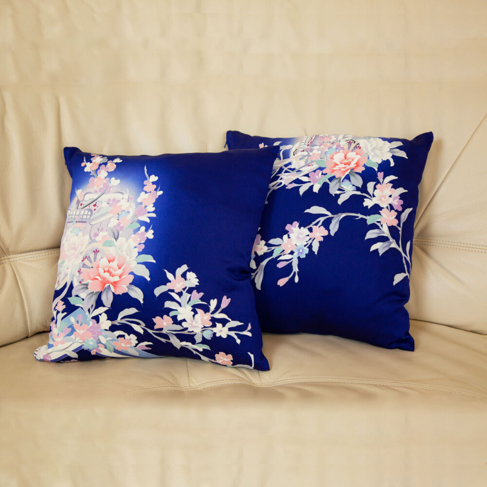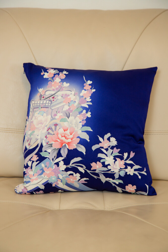 ロイヤルブルー地に御所車や牡丹や菊や紅葉文など