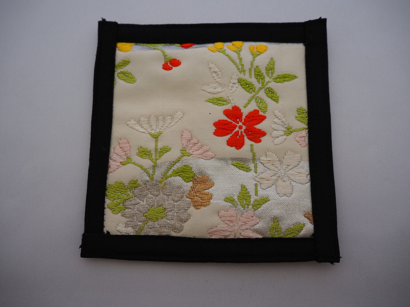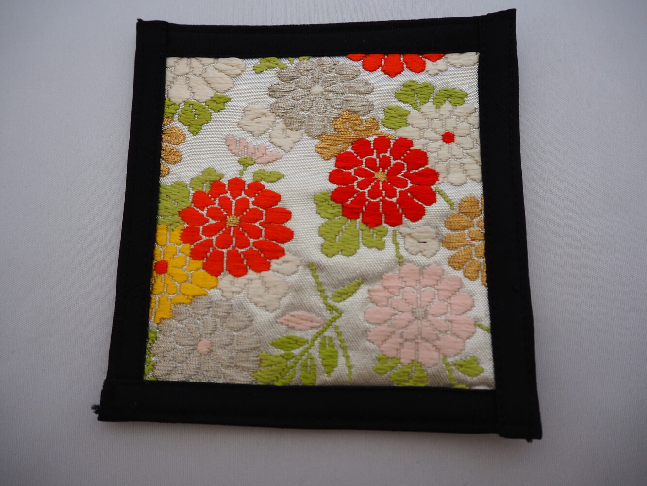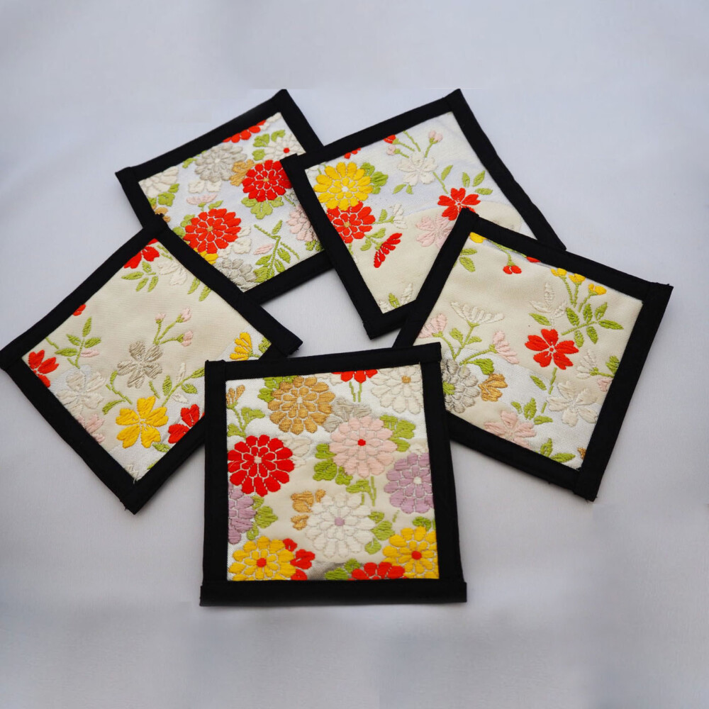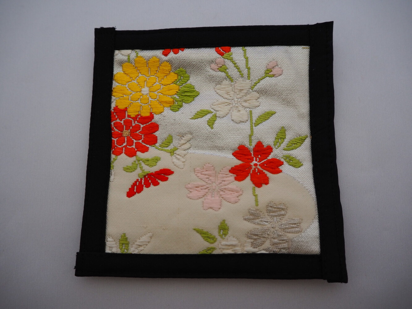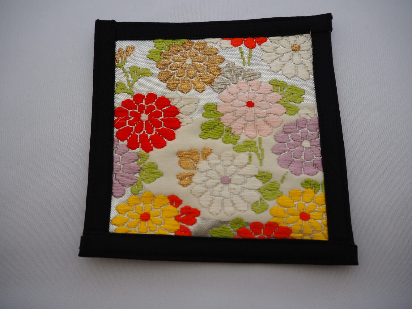 シルバー地にカラフルな小菊や桜が愛らしい柄です。