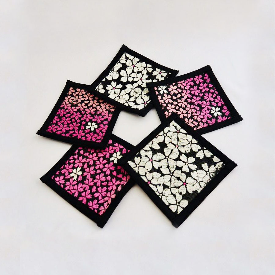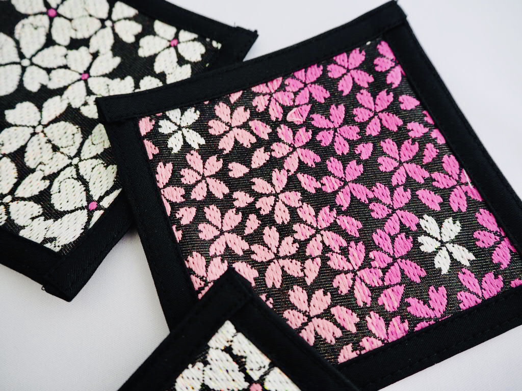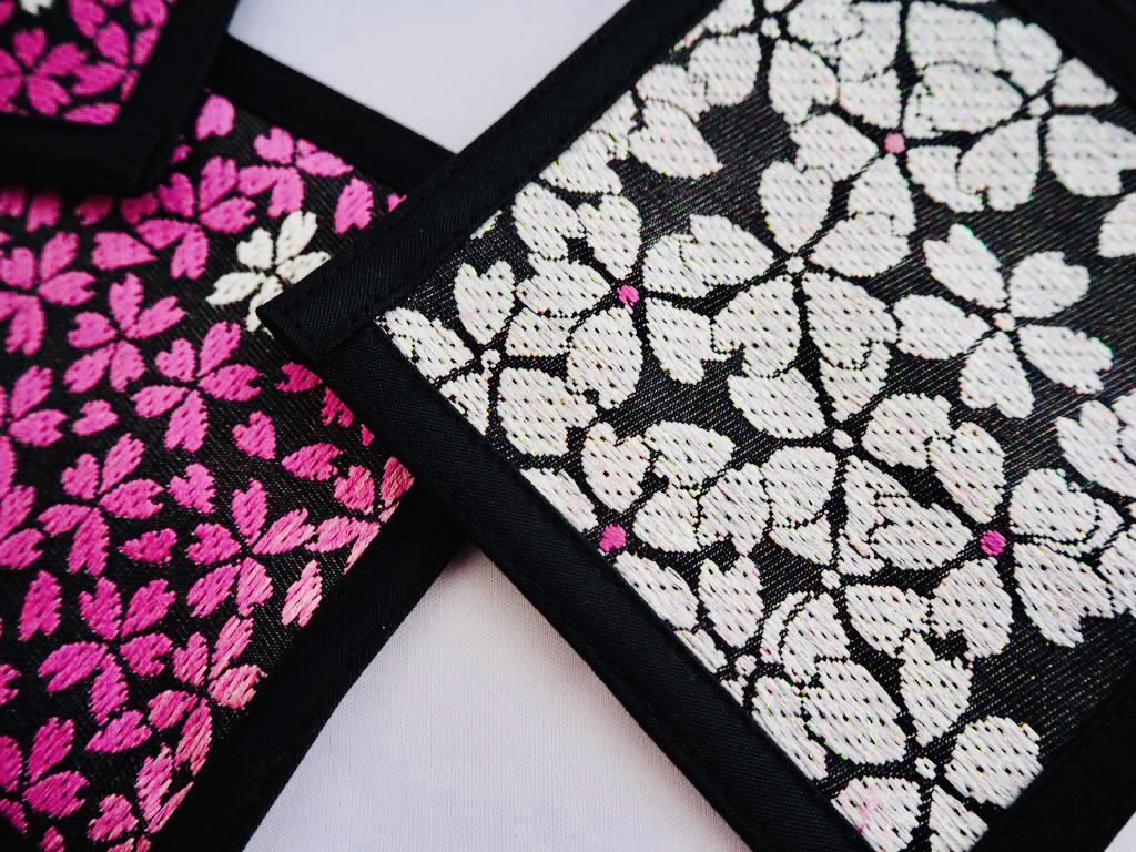 黒地に白とピンクの小桜を織り出し、甘くなりすぎない印象。