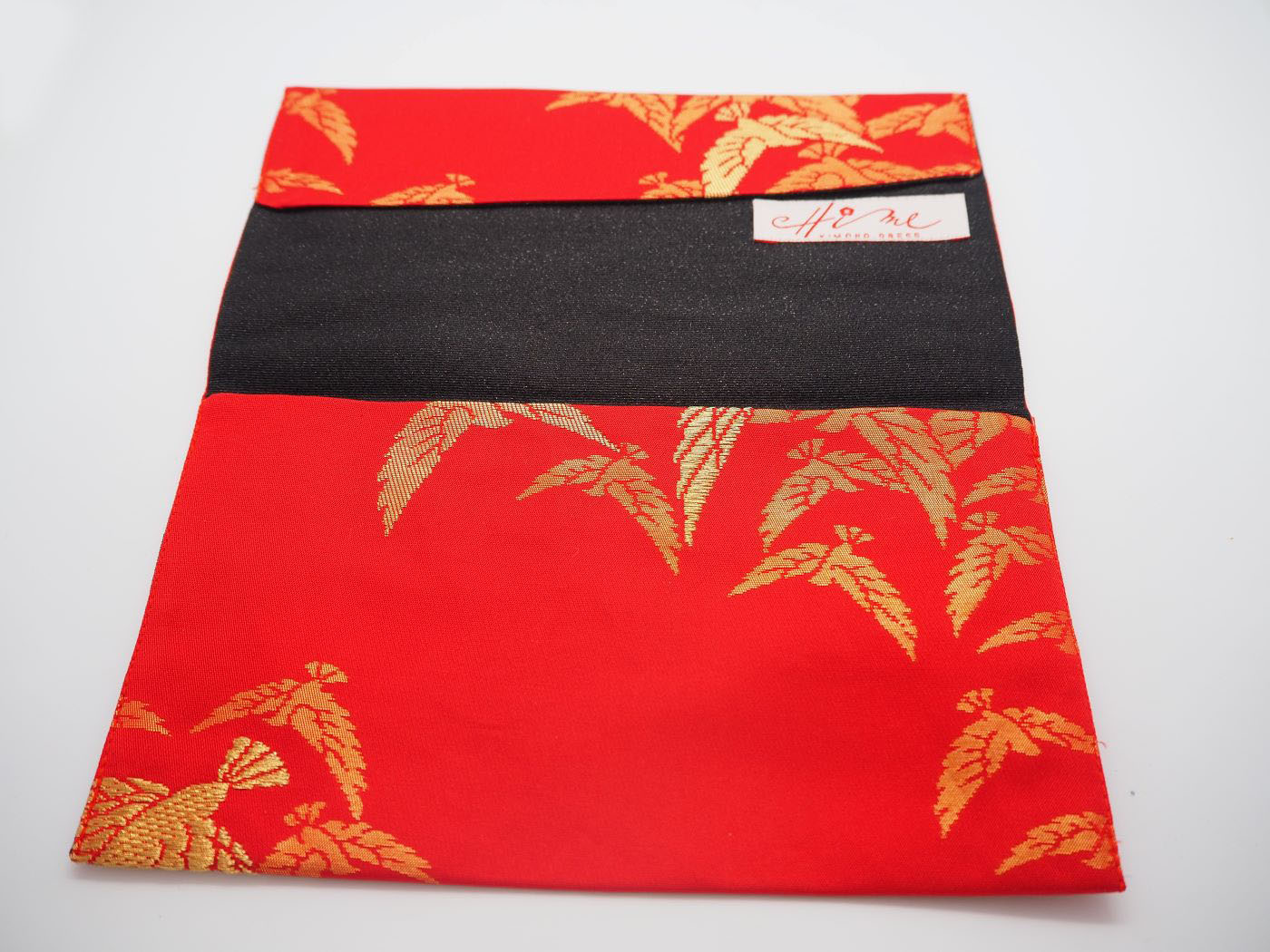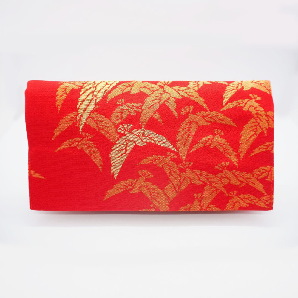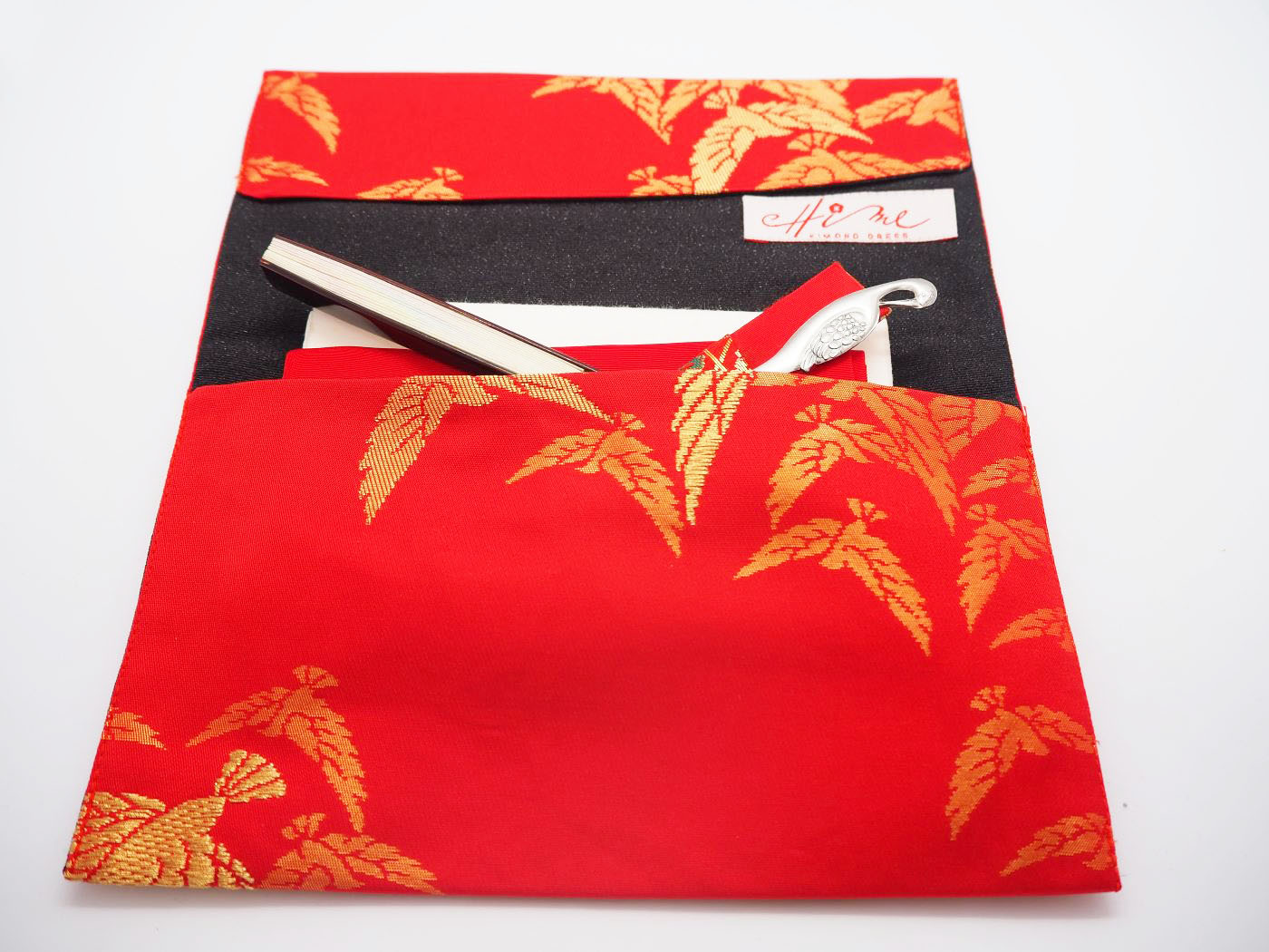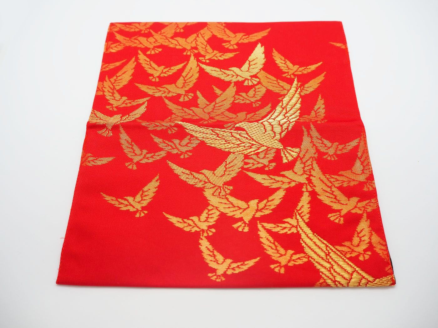 赤地に金糸で刺しゅうされた「平和の象徴」鳩が飛んでいる文様。