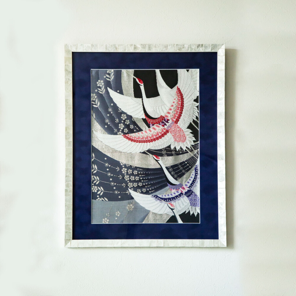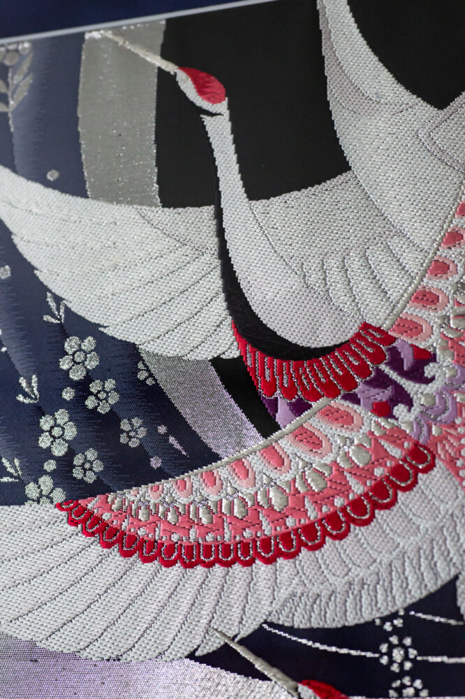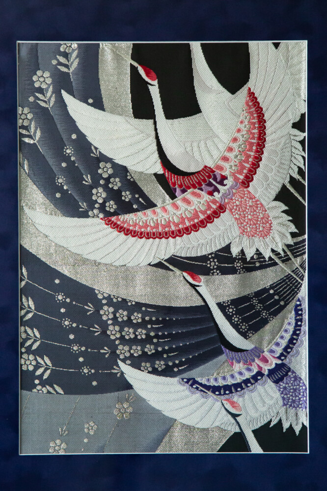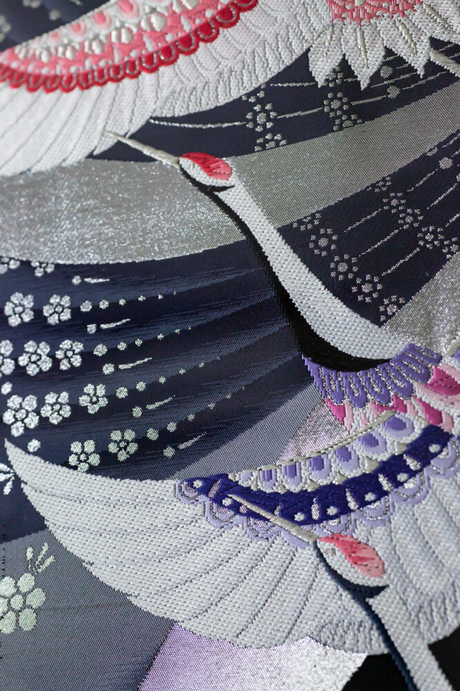 飛鶴が群をなして飛翔している群鶴を思わせるシルバー、ピンク、パープルの色合いがゴージャスです。