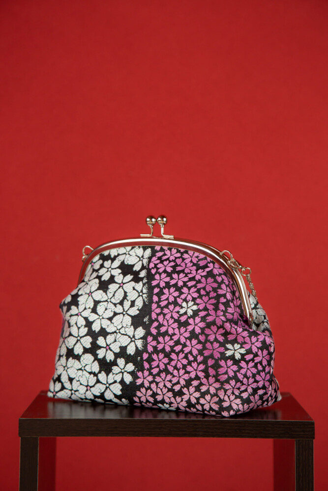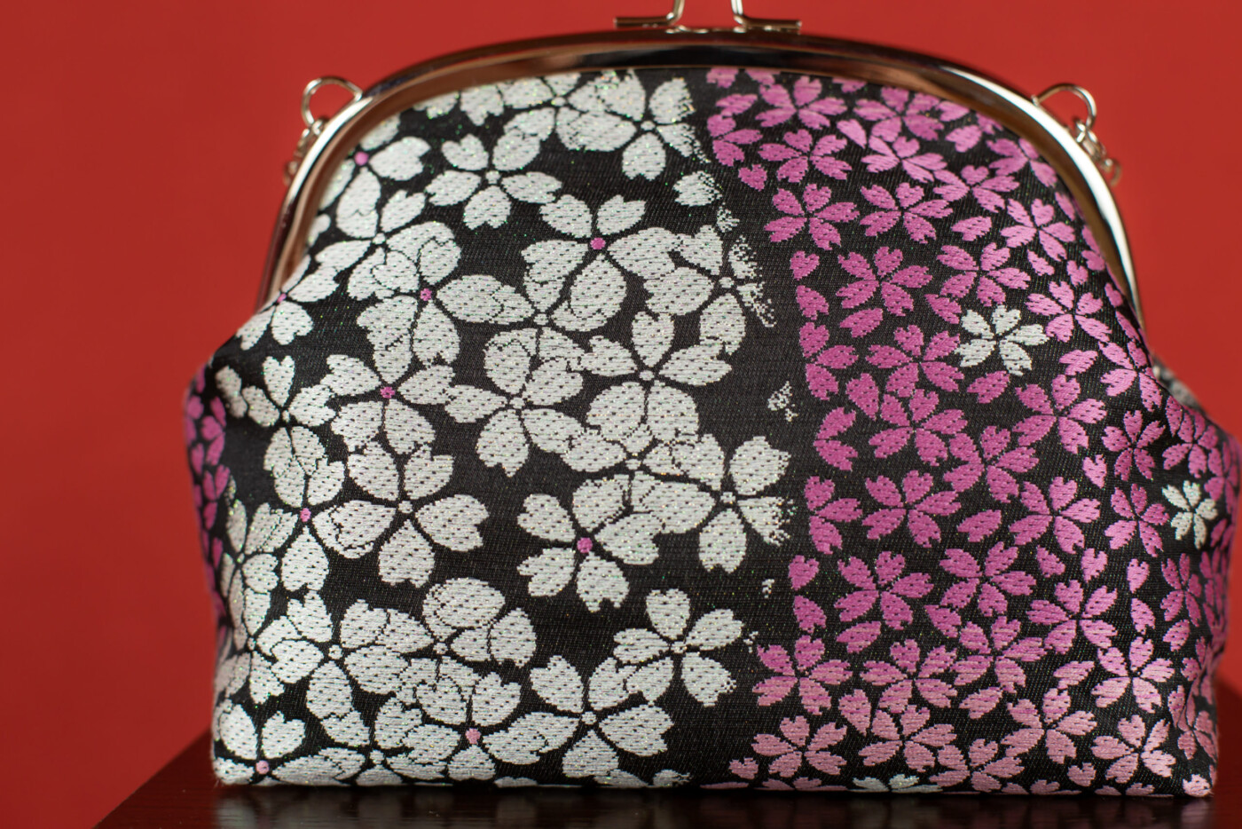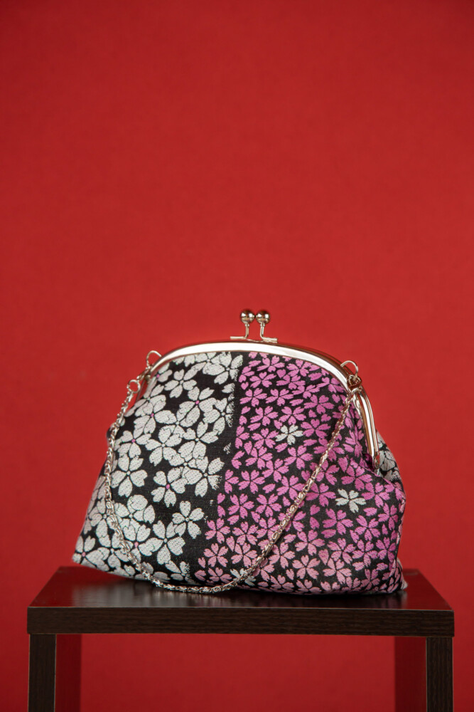 黒地に白とピンクの小桜を織り出し、甘くなりすぎない印象。