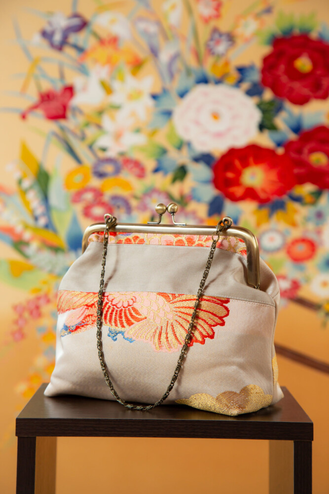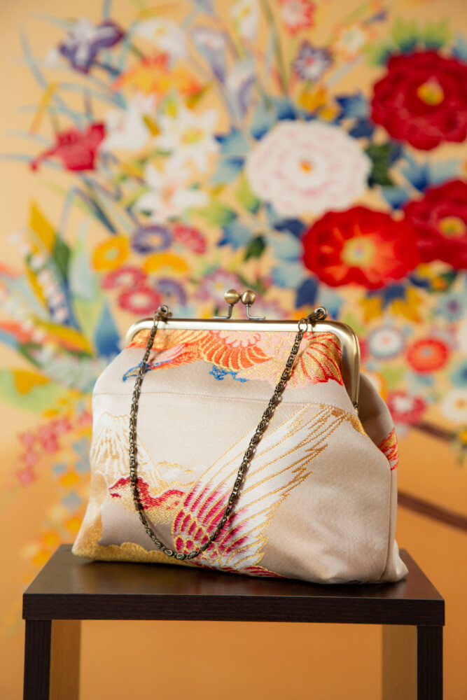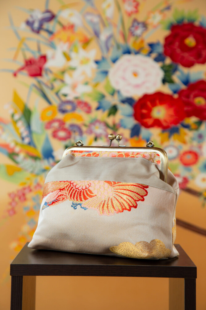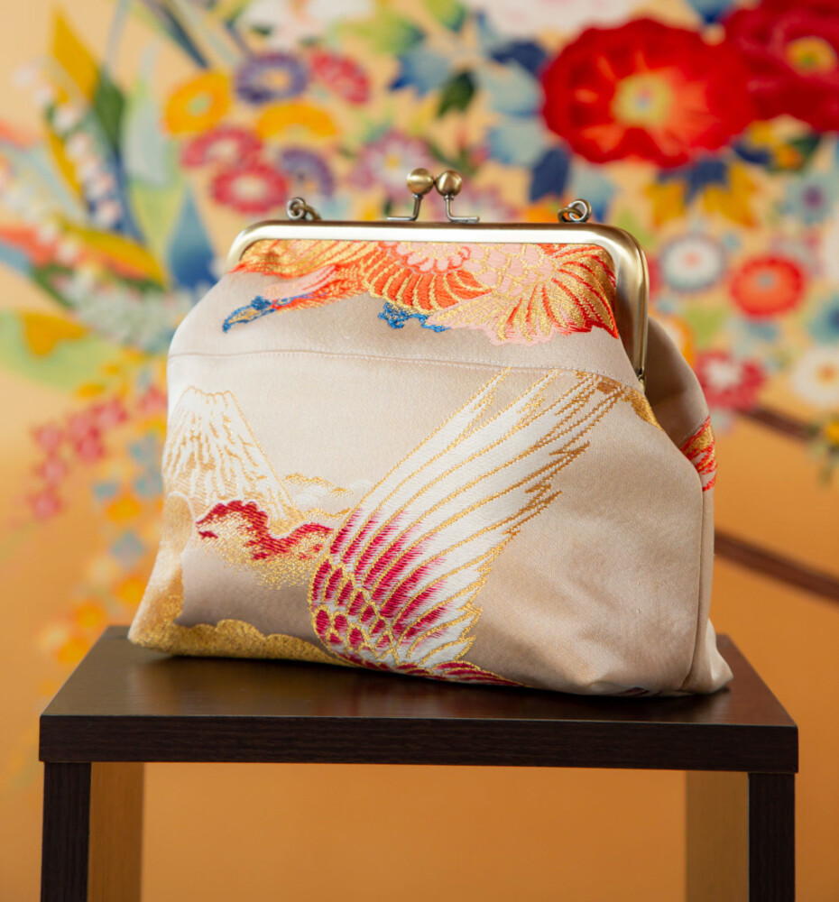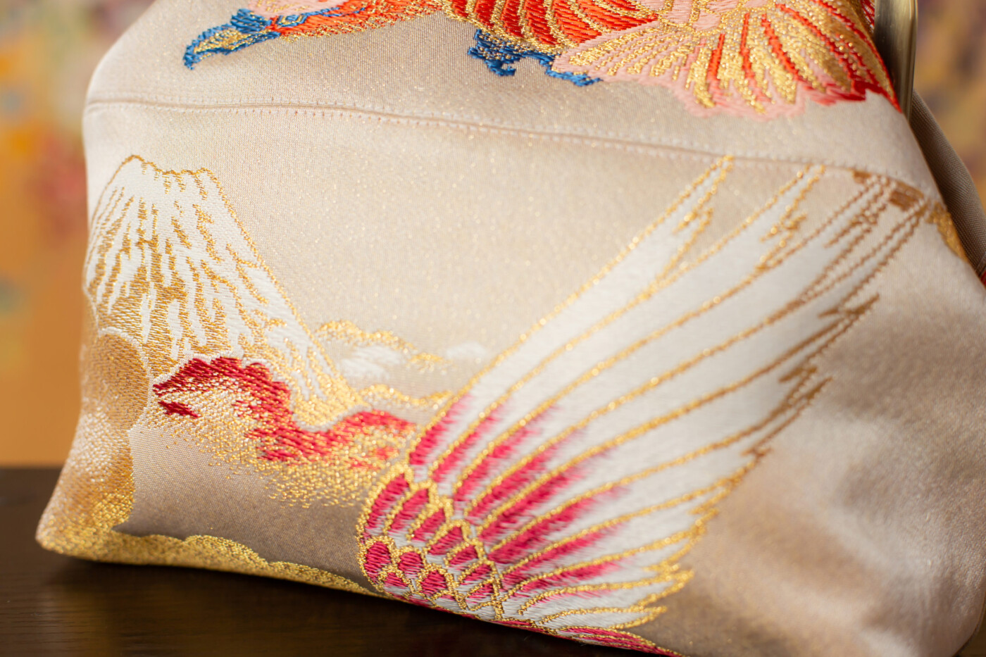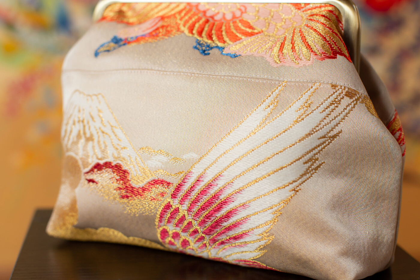 縁起物の代名詞、富士と鷹が織り出されたバッグ。