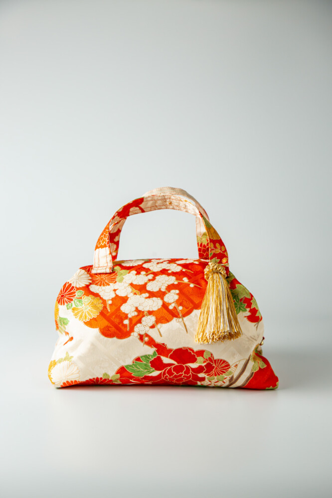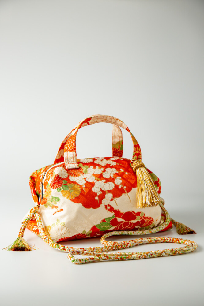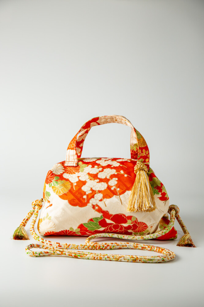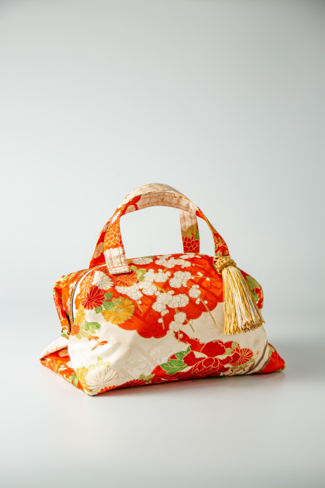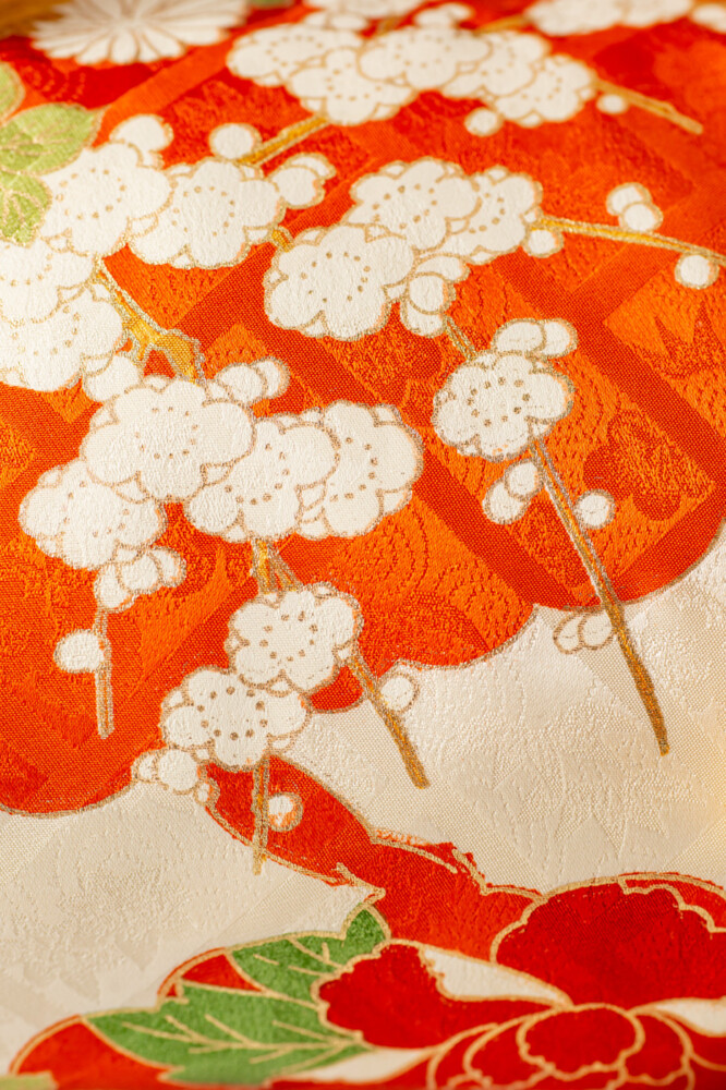 オレンジ地に四季草花、八橋文様。