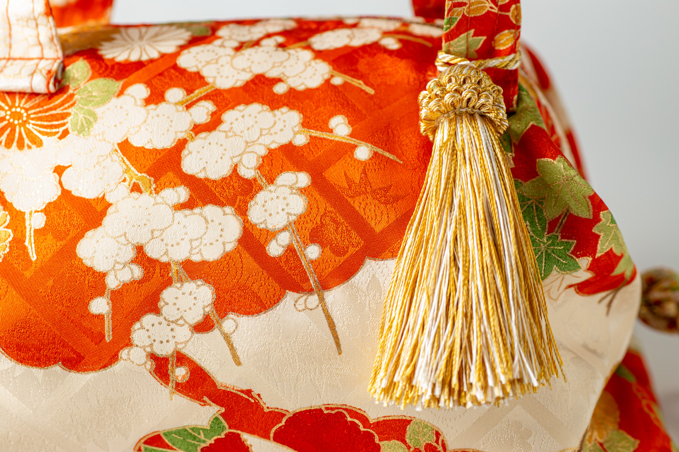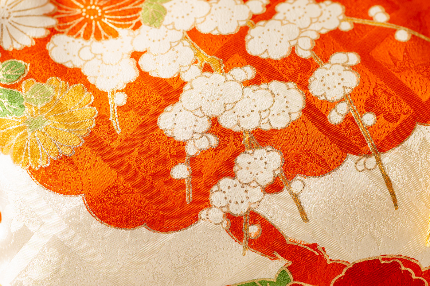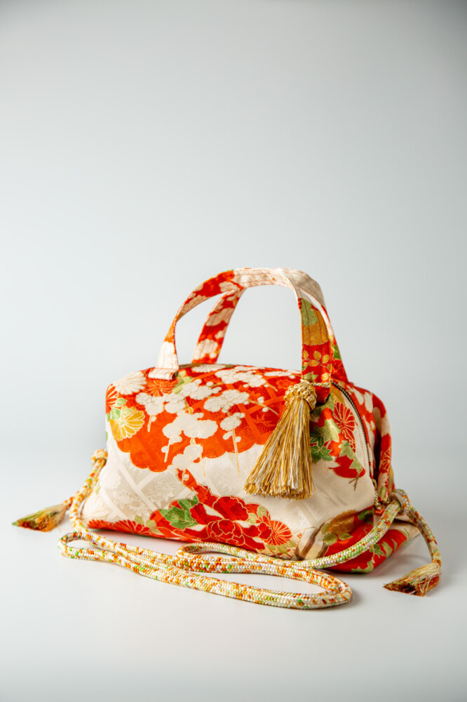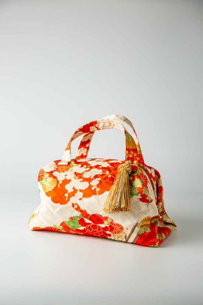 オレンジ地に四季草花、八橋文様。
