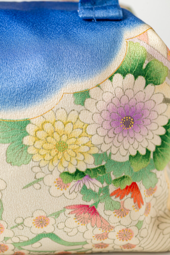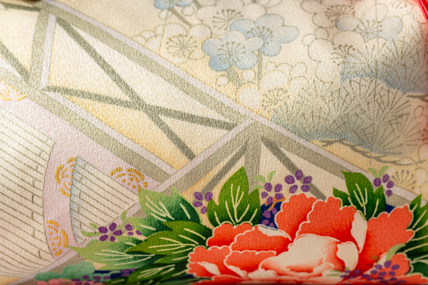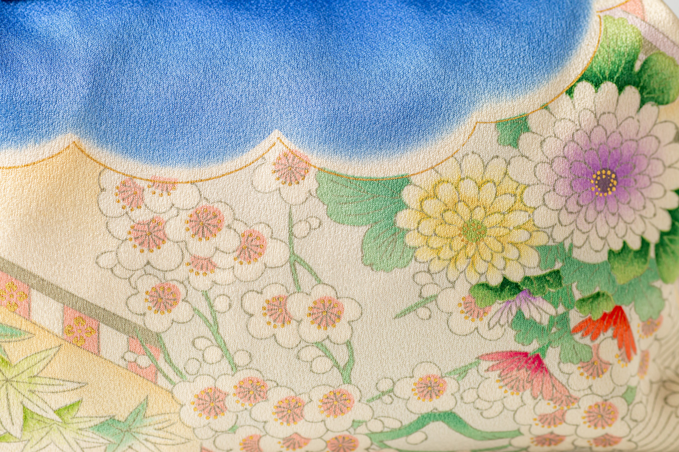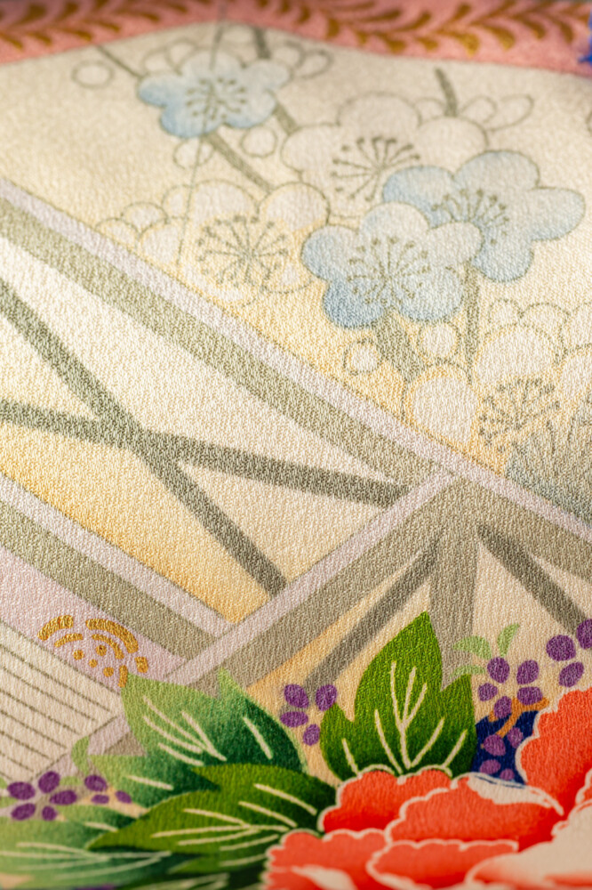 梅、菊、牡丹、紅葉などの四季草花文様で優しい色合い。