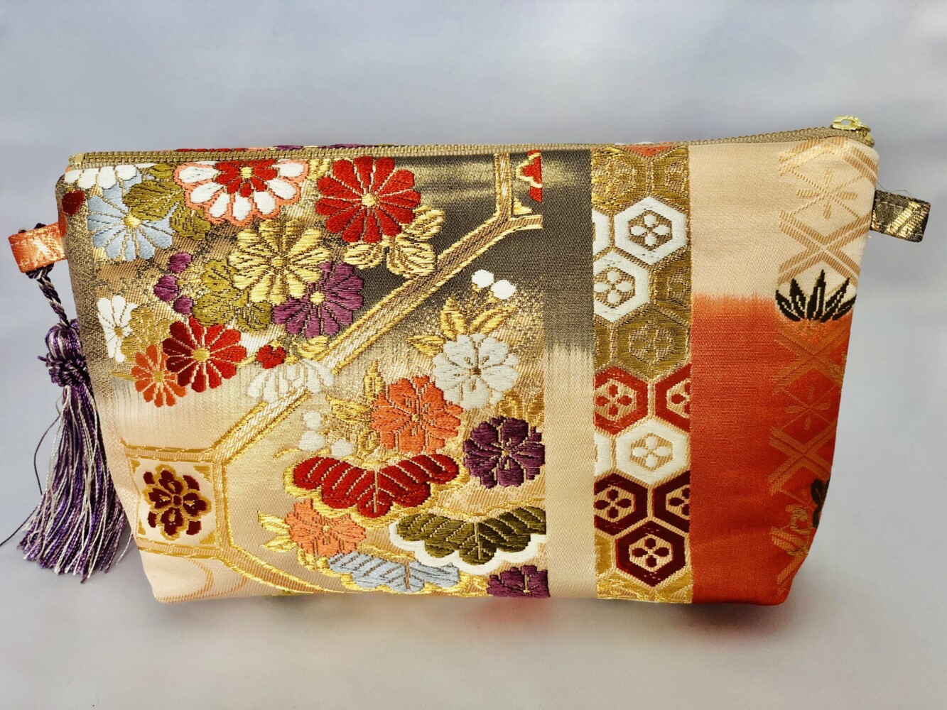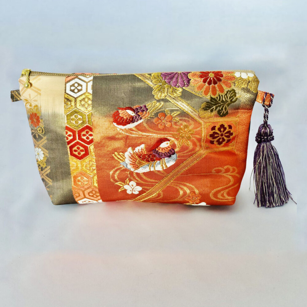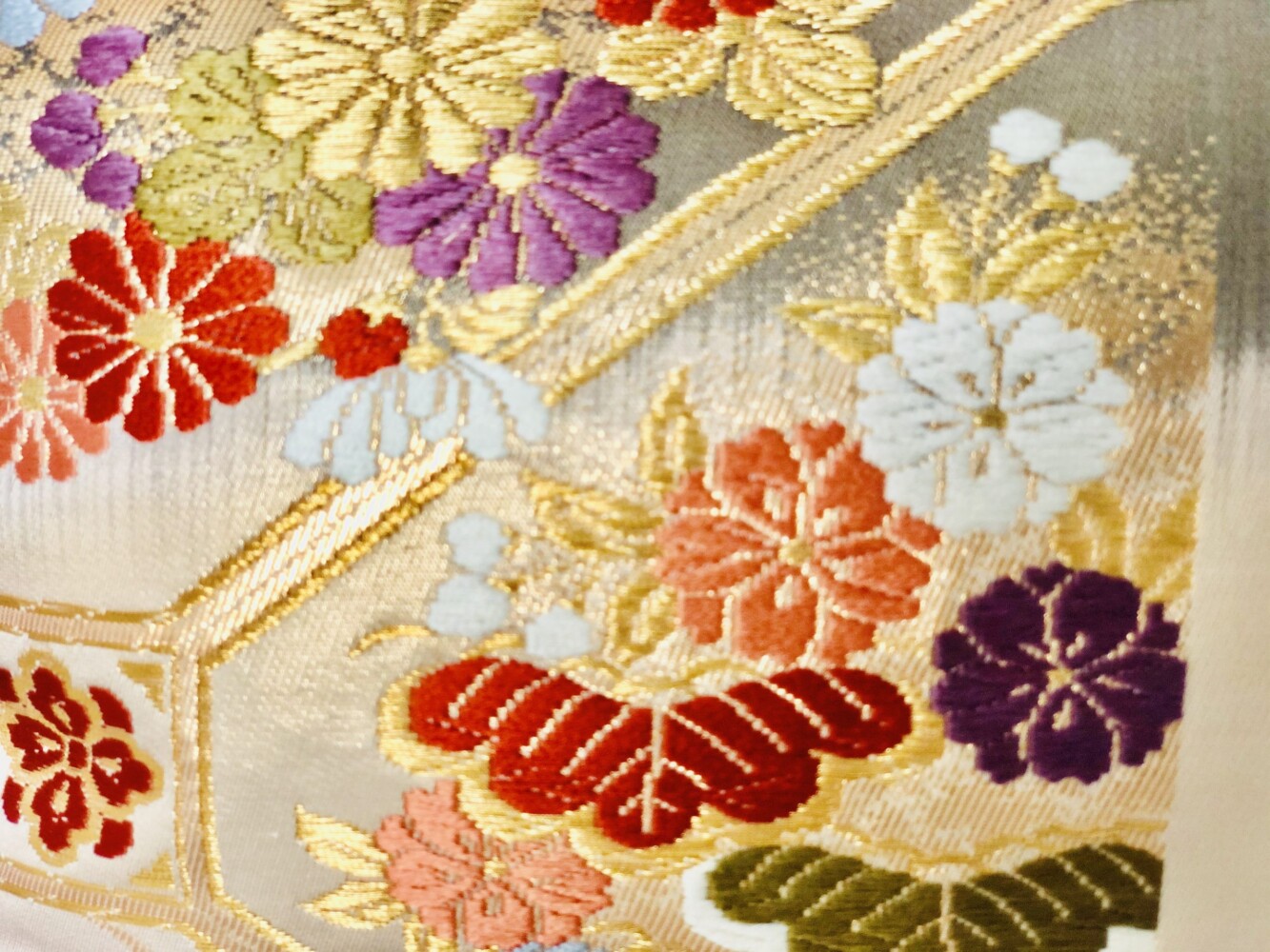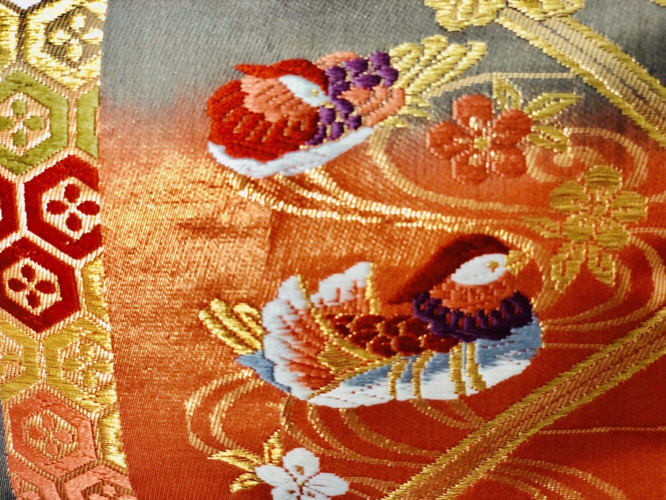 夫婦の変わらぬ愛を象徴する鴛鴦文(えんおうもん)(おしどり)と笠松、菊、桜など、古来から尊ばれていた草花木を亀甲紋の中に入れた吉祥文様。