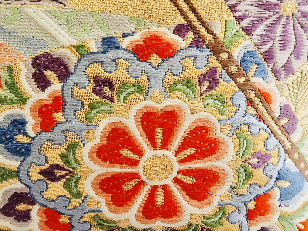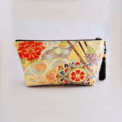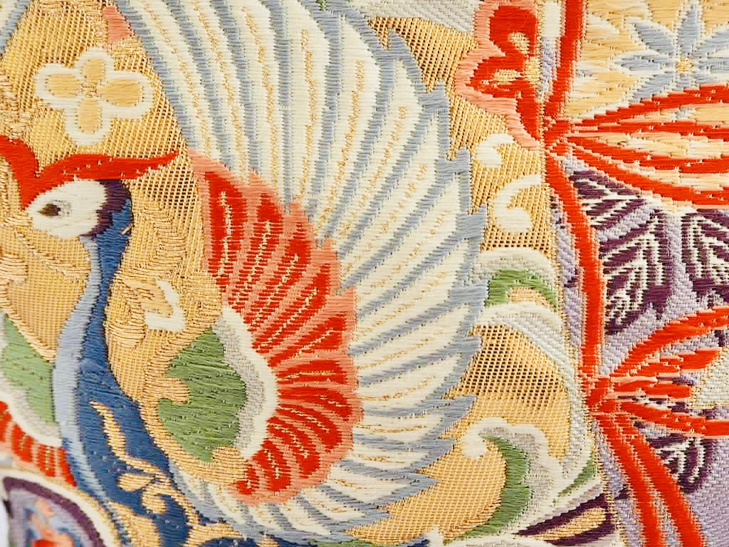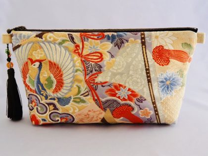宝尽くし文と牡丹の花、鳳凰などのカラフルな色合いがとても上品でゴージャスな仕上がりのパーティーバッグです。