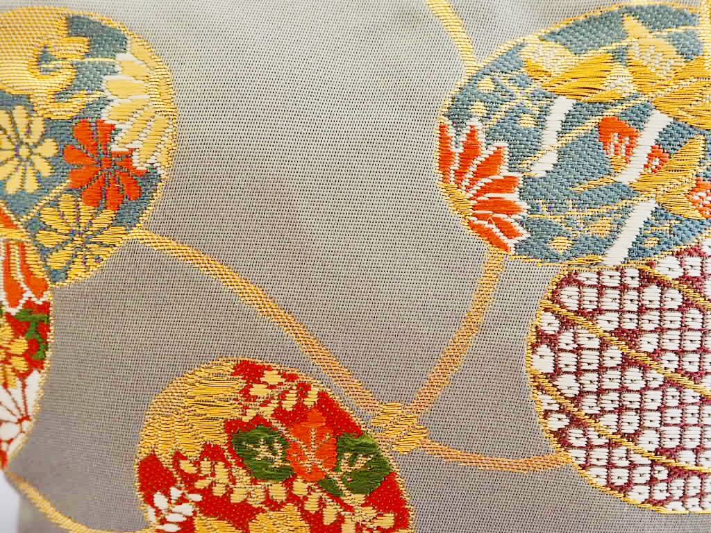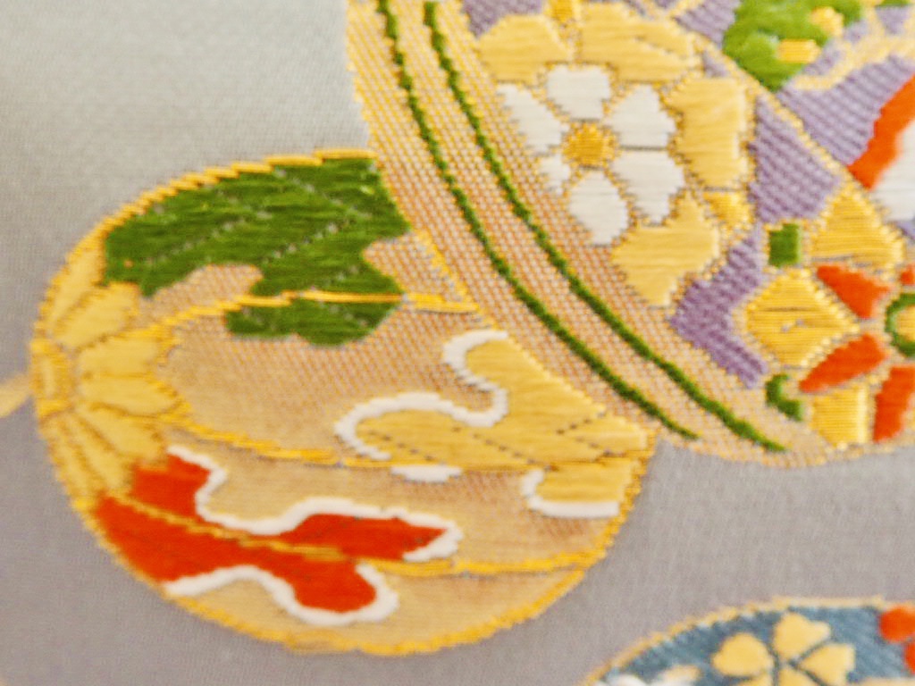 瓜文の中に鳥や草花が描かれていて、金糸のツルがらせん状に描かれて、楽しくなるような文様です。