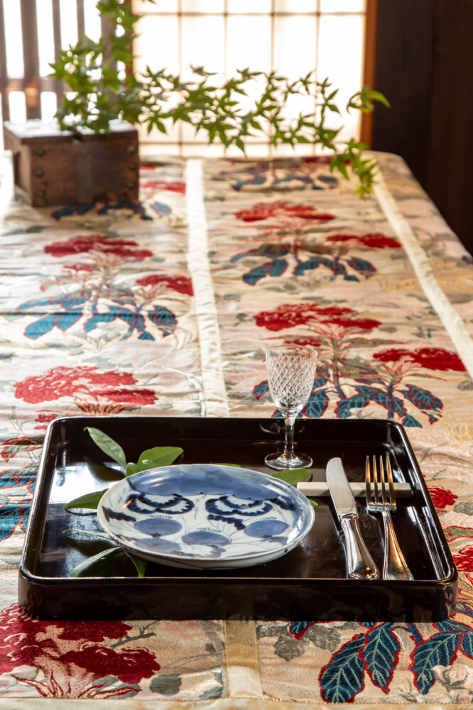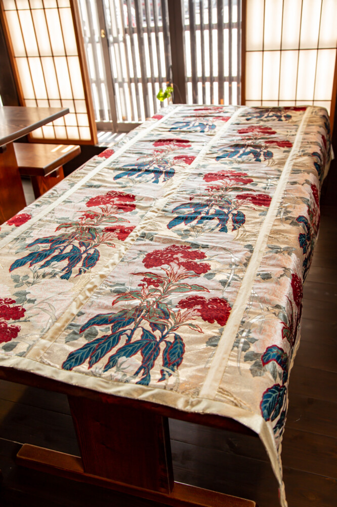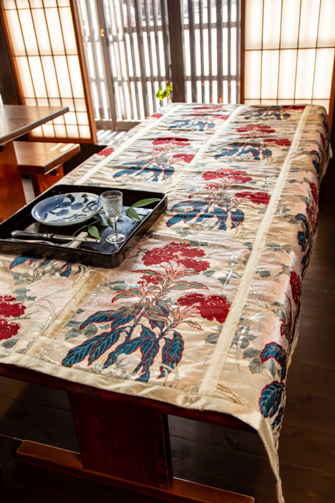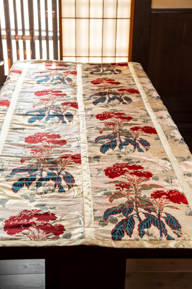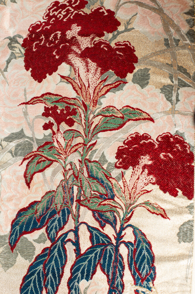 ゴールド地に、ピンクのバラに赤い大鶏頭が描かれています。