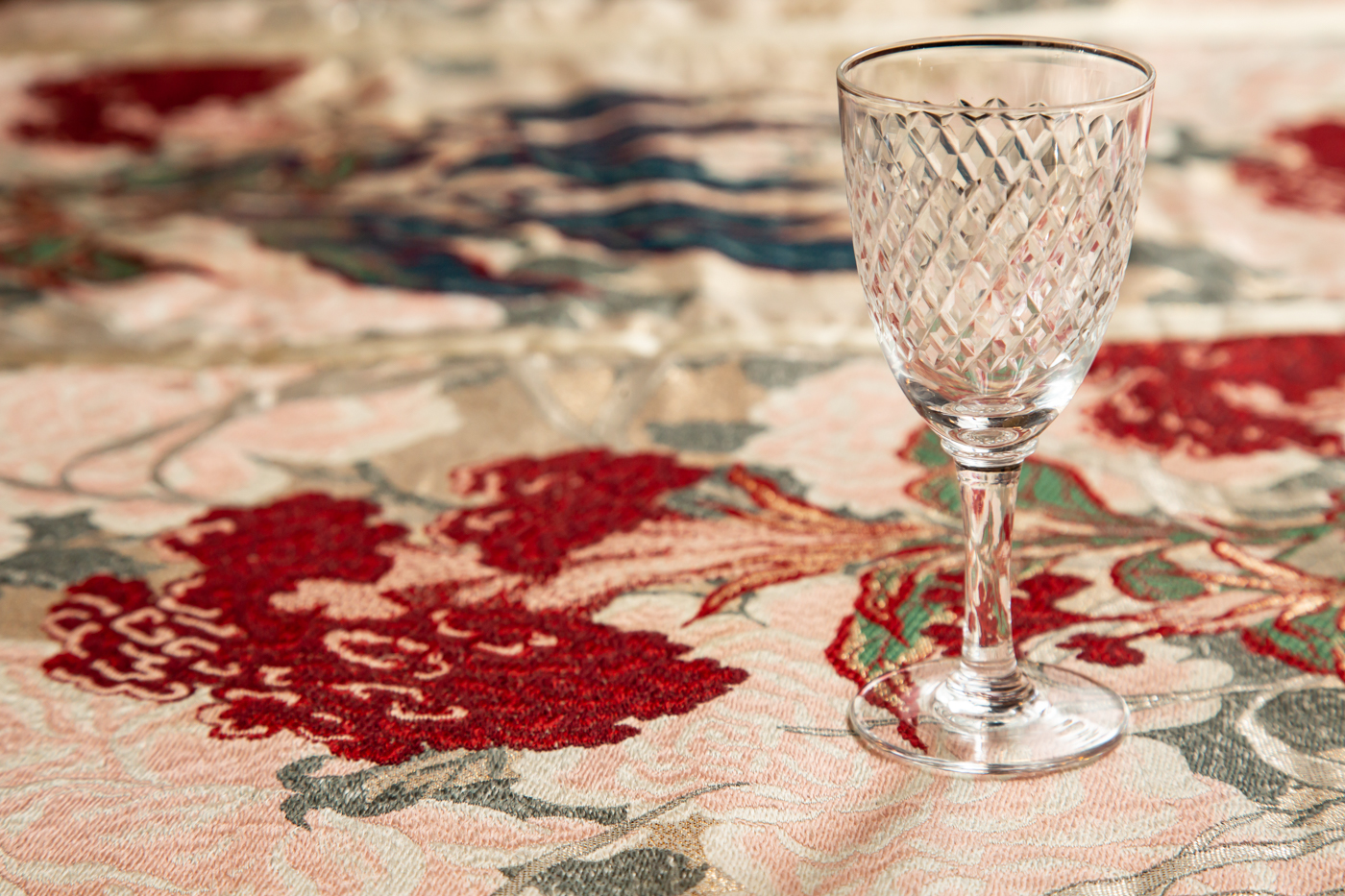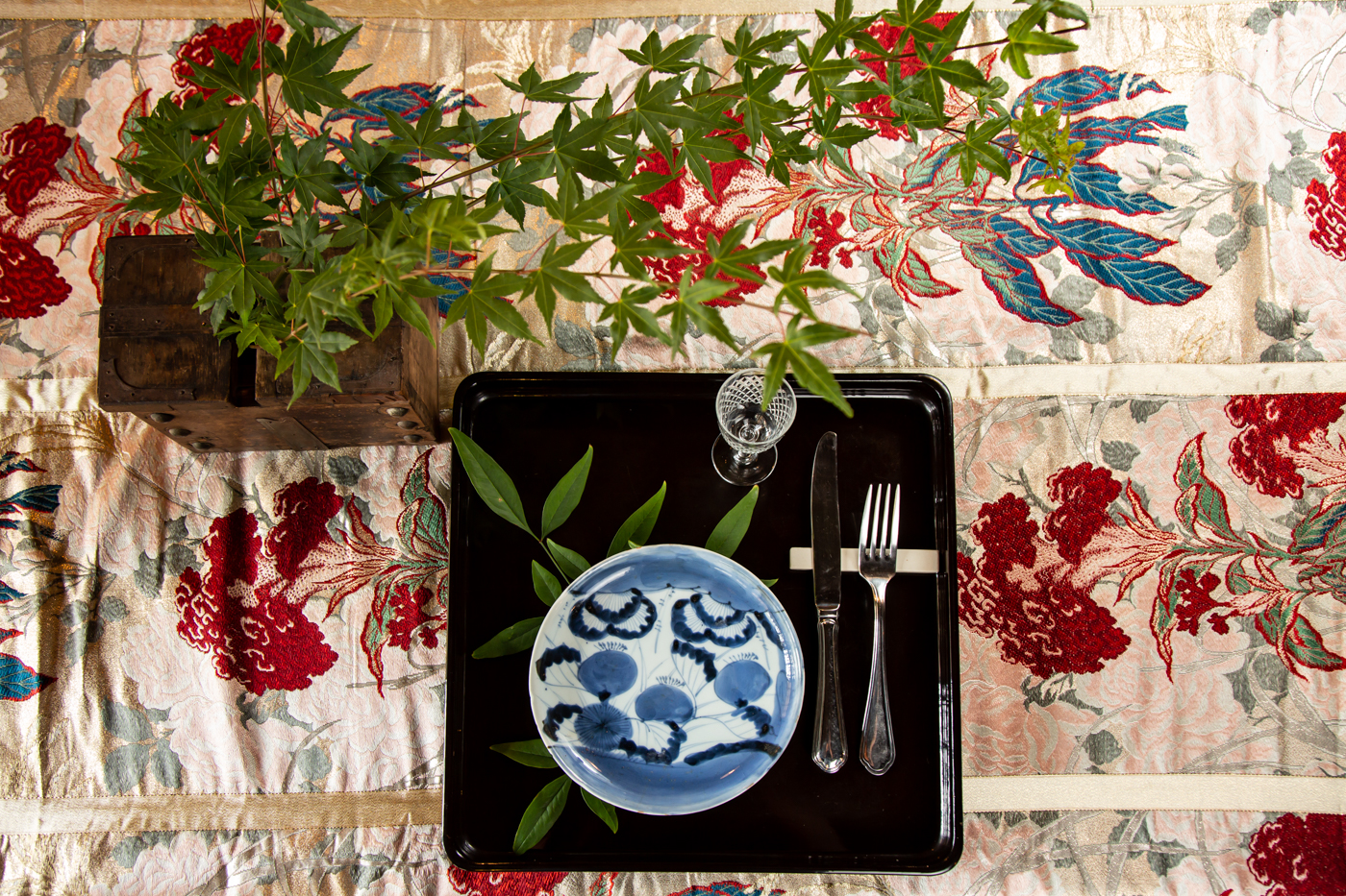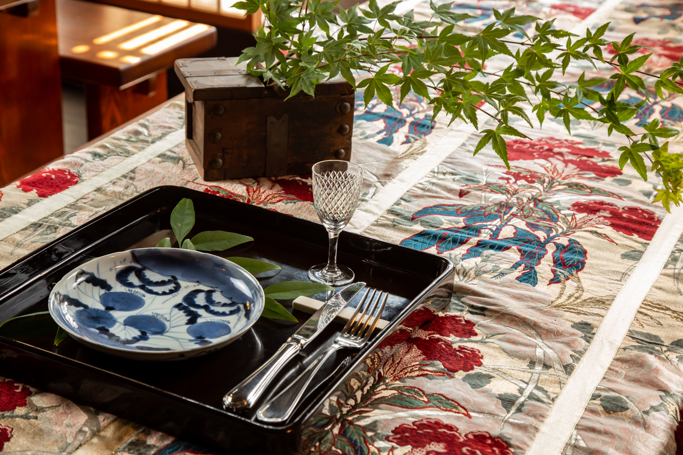 ゴールド地に、ピンクのバラに赤い大鶏頭が描かれています。