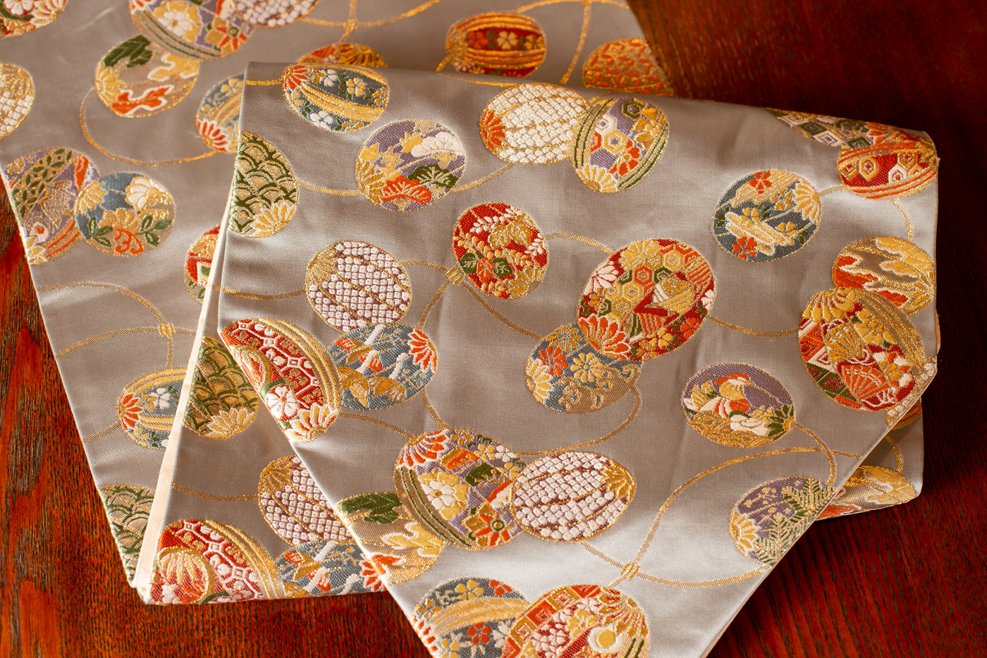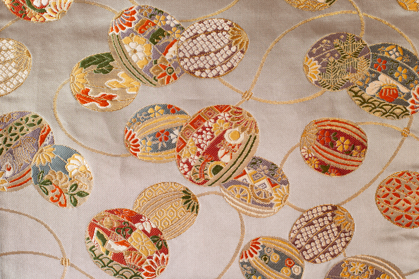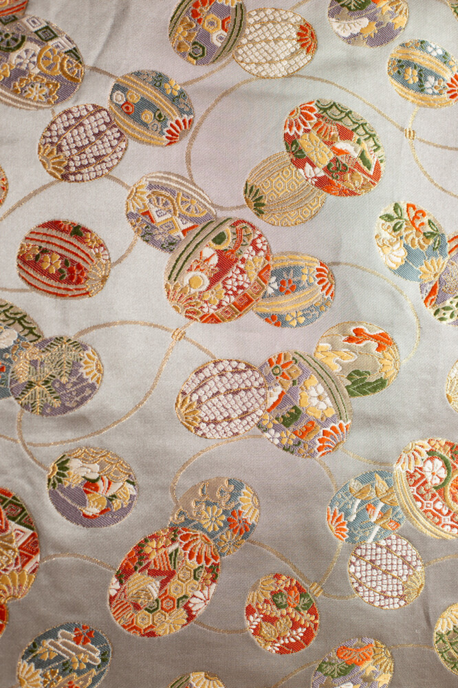 瓜文の中に鳥や草花が描かれていて、金糸のツルがらせん状に描かれて、楽しくなるような文様です。