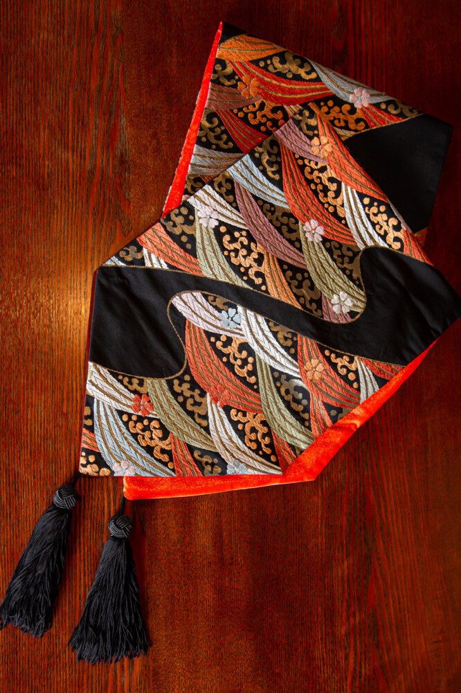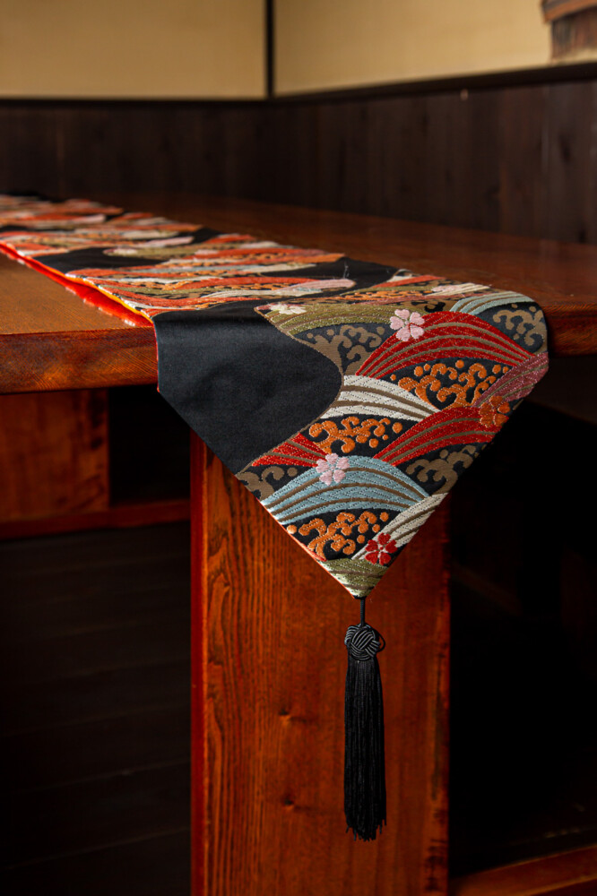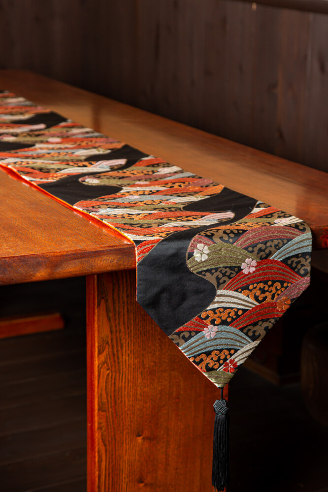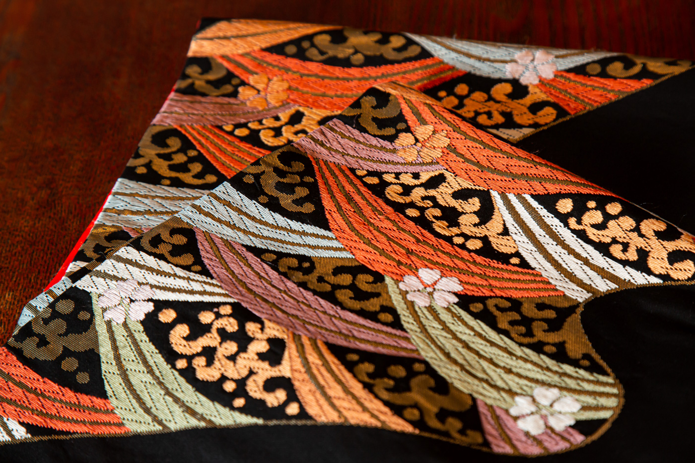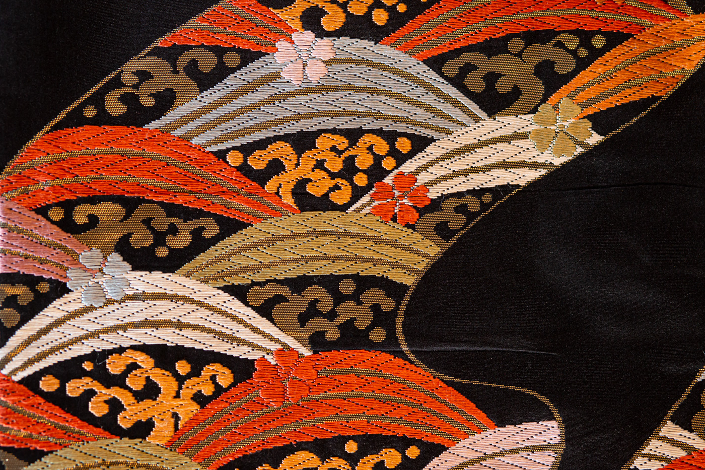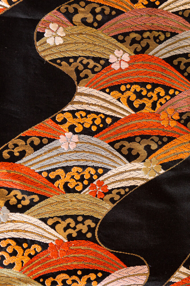 黒地に躍動感の波頭(なみがしら)に桜文様が散りばめられていて、永遠や不滅、長寿、誕生などを意味し吉祥文様です。