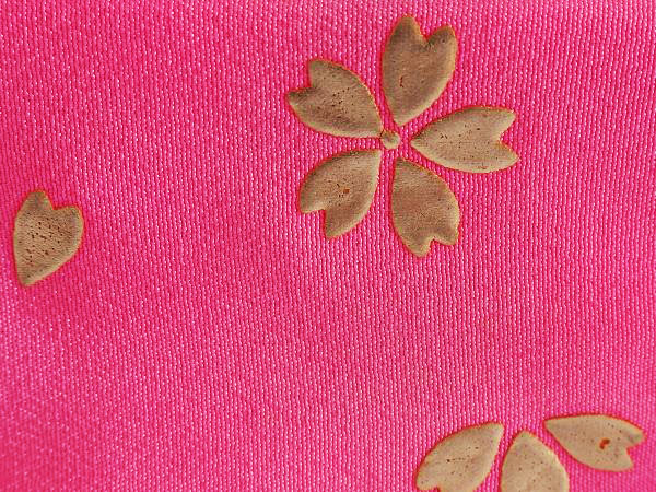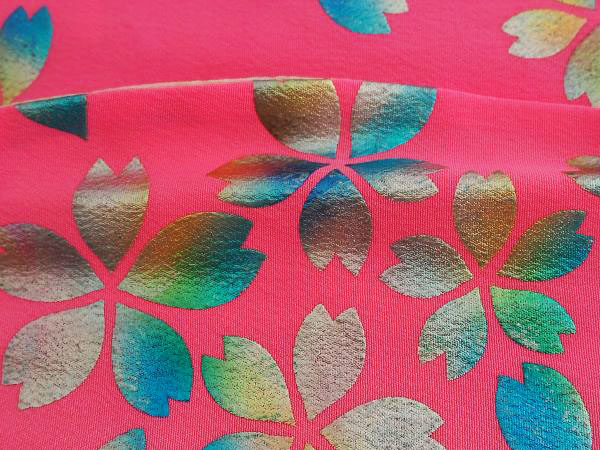 ピンクの打掛地に、ブルーやシルバーのメタリックな桜の花びらが舞う。