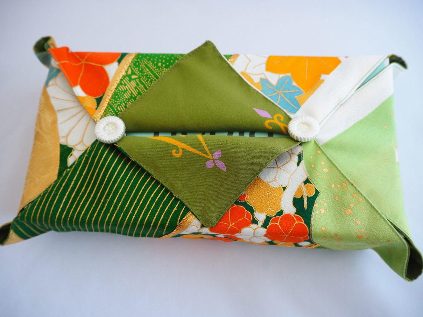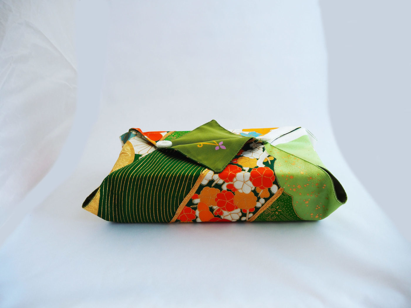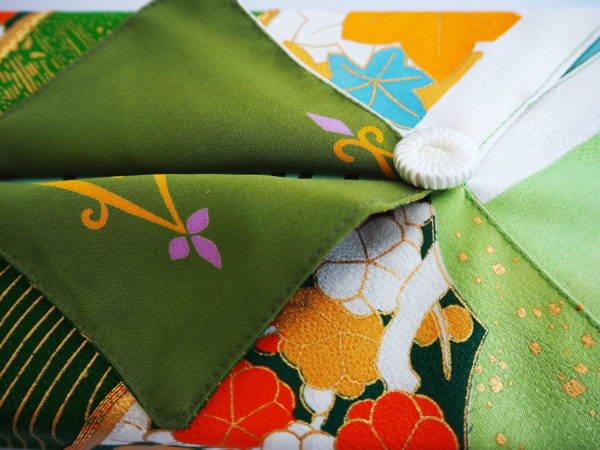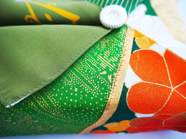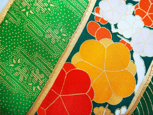緑地に桜川やゴールドで型どられた菊、牡丹、紅葉などの四季草花文様が素敵に出来上がりました。